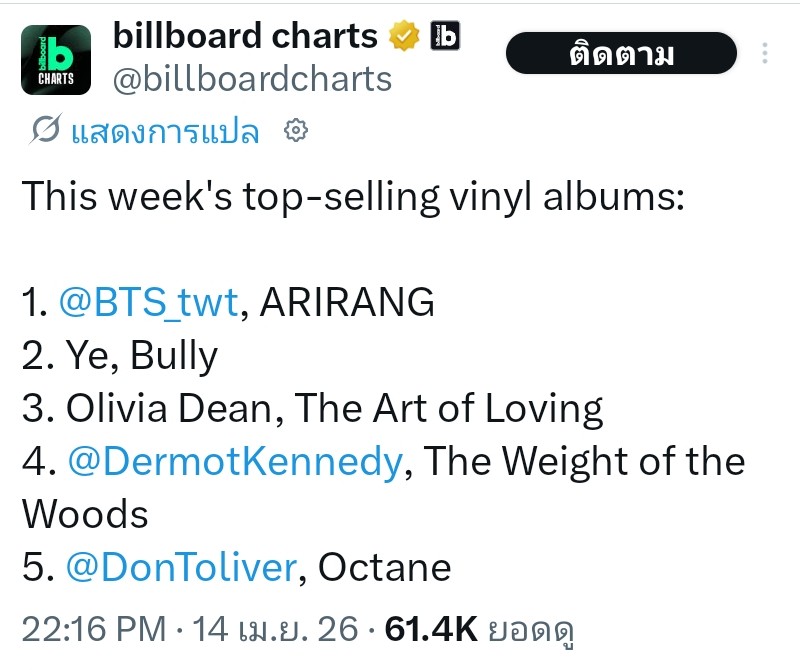 "ARIRANG" ของ BTS ขายเกิน 1 ล้านยูนิตในอเมริกาแล้ว เป็นสถิติที่เร็วที่สุดในประวัติศาสตร์ของศิลปิน Asia