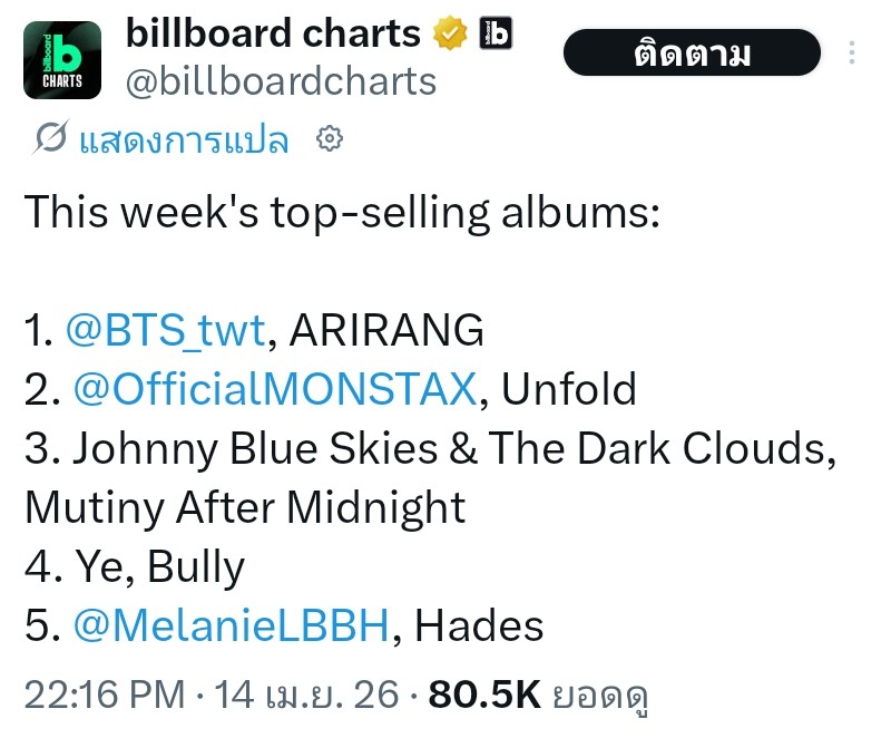 "ARIRANG" ของ BTS มียอดขายเกิน 1 ล้านยูนิตในสหรัฐอเมริกาแล้ว ทำให้ได้รับสิทธิ์การรับรองระดับ Platinum — อัลบั้มนี้ทำสถิติเป็นอัลบั้มของศิลปินเอเชียที่แตะหลักไมล์นี้ได้เร็วที่สุดใ