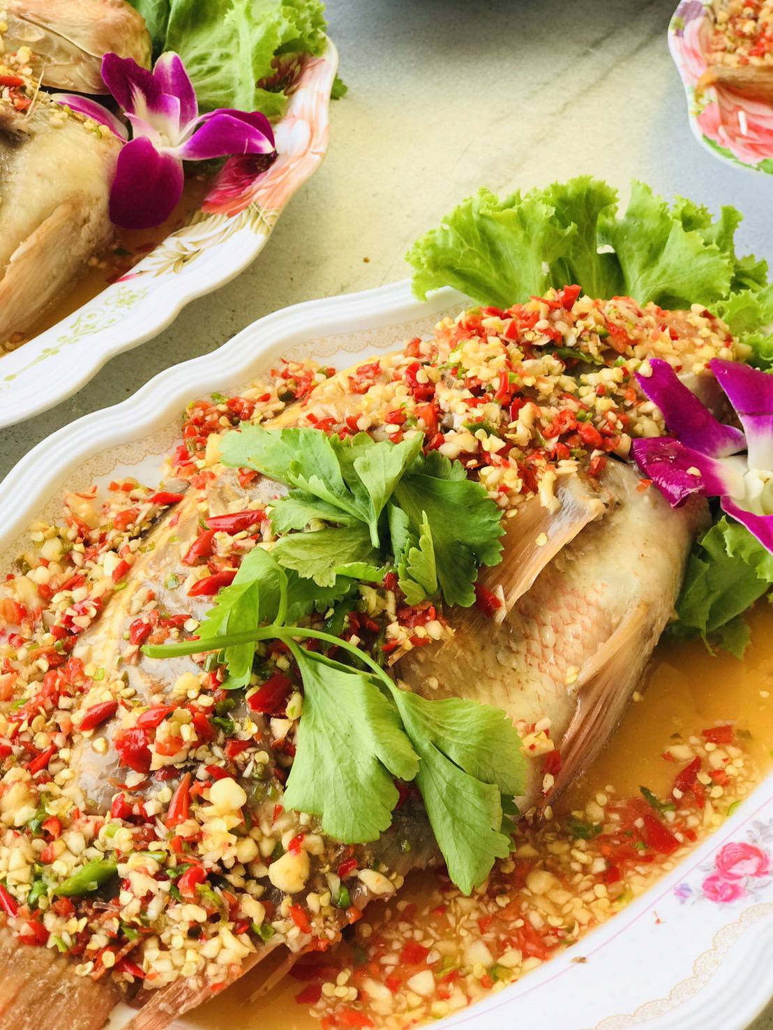 ปลากะพงนึ่งซีอิ๊ว/มะนาว: "ปลา" หมายถึงความเหลือกินเหลือใช้ เราใช้ปลาสดจากบ่อ เนื้อหวานแน่น ไม่คาว