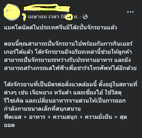 ข้อมูลจริง vs ข้อมูลที่แชร์กัน เรื่อง แมคโดนัลด์จีน กับโต๊ะจักรยานฟิตเนส