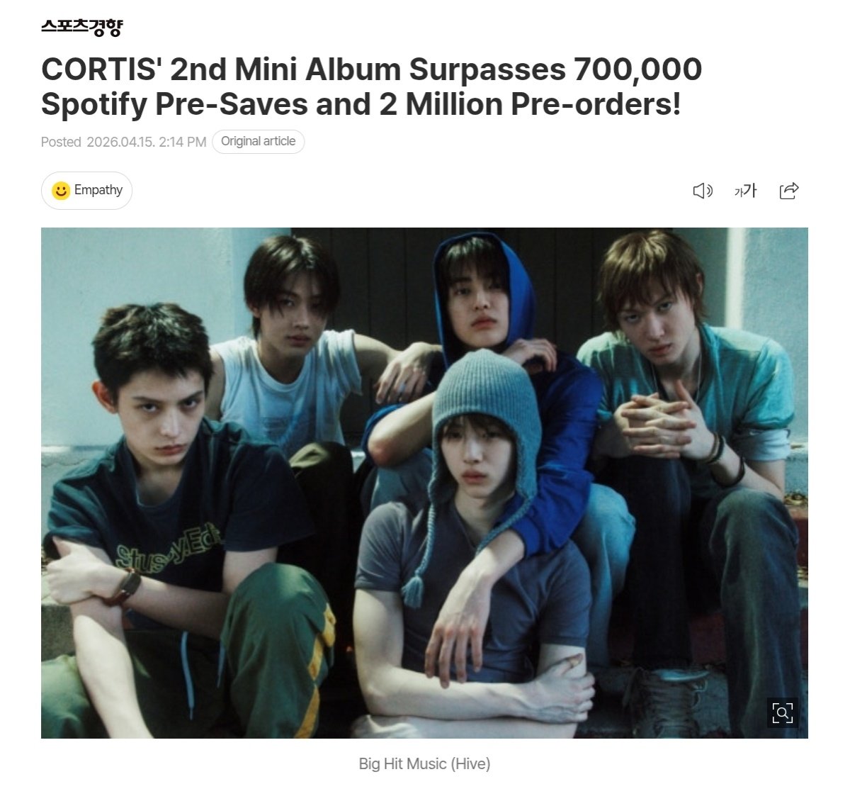 มินิอัลบั้มชุดที่สองของ CORTIS (Martin, James, Juhoon, Seonghyeon, Keonho) ชื่อ ‘GREENGREEN’ มียอด ‘Pre-save’ บนแพลตฟอร์มสตรีมมิ่งเพลงระดับโลกอย่าง Spotify ถึง 707,000 ครั้ง เมื่อวันที่ 15 เมษายน ซึ่งทะลุ 700,000 ครั้งไปได้ภายในเวลาประมาณหกสัปดาห์หลังจากประกาศกำหนดการวางจำหน่ายเมื่อวันที่ 6 มีนาคม และแม้จะเข้าสู่สัปดาห์ที่หกแล้ว ยอด Pre-save ก็ยังคงเพิ่มขึ้นอย่างต่อเนื่องประมาณ 10,000 ครั้งต่อวัน