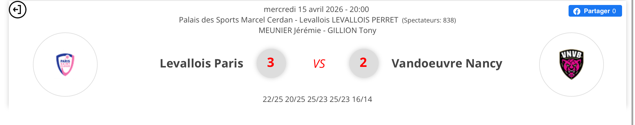 Vandoeuvre Nancy 2-3 Levallois Paris (25-22 25-20 23-25 23-25 14-16)
