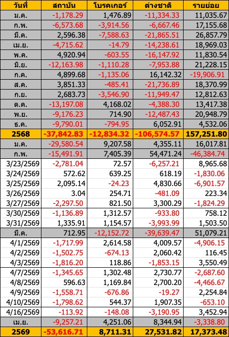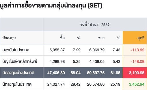 Sinthorn Summary 16/4/2569 : ต่างชาติขายสุทธิ -3,190.95 ลบ.