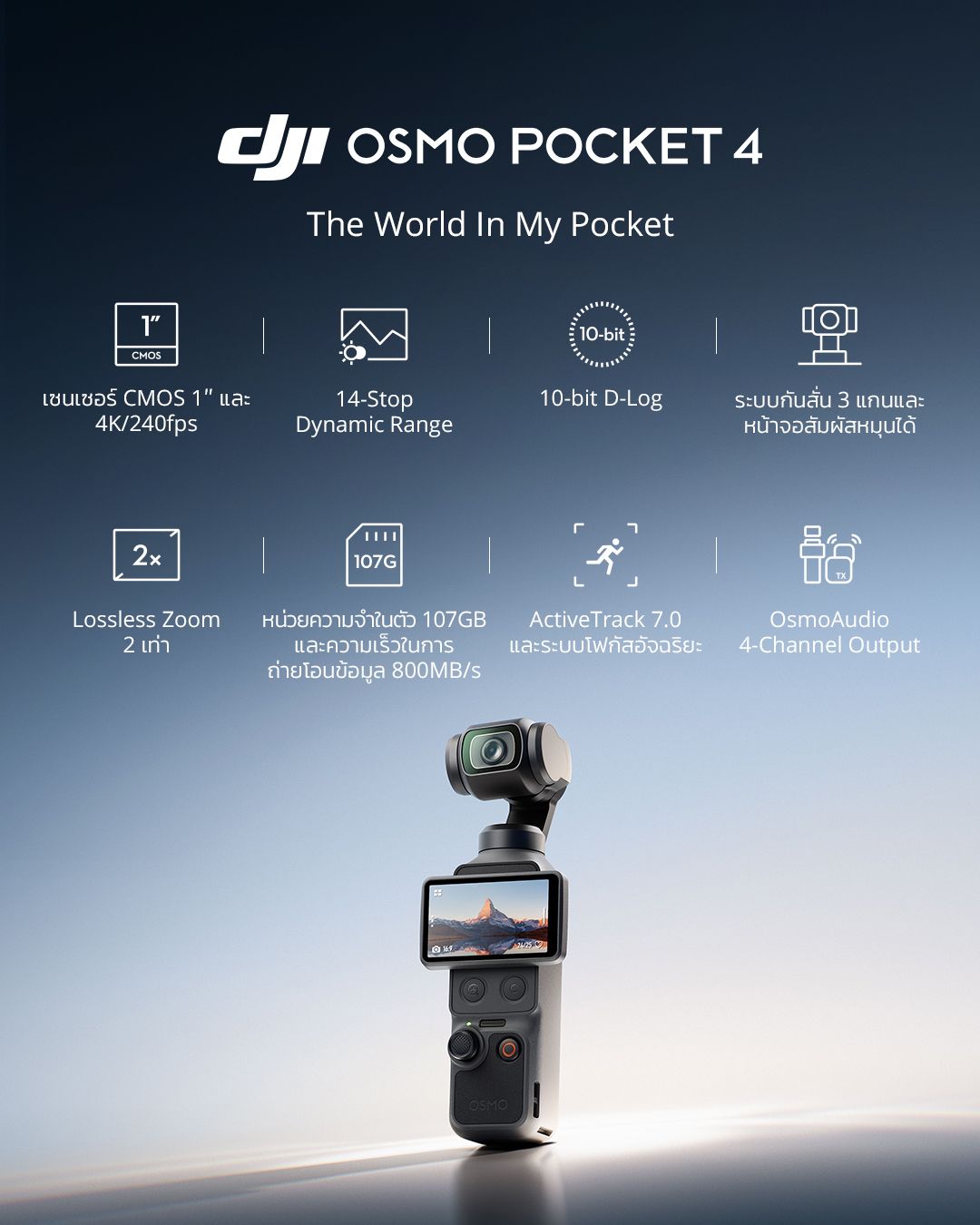 🎥📸ราคา DJI Osmo Pocket 4 เซนเซอร์ CMOS 1 นิ้ว ถ่ายวิดีโอ 4K ที่ 240fps มีพื้นที่จัดเก็บในตัว 107GB เริ่มต้น 15,500 บาท