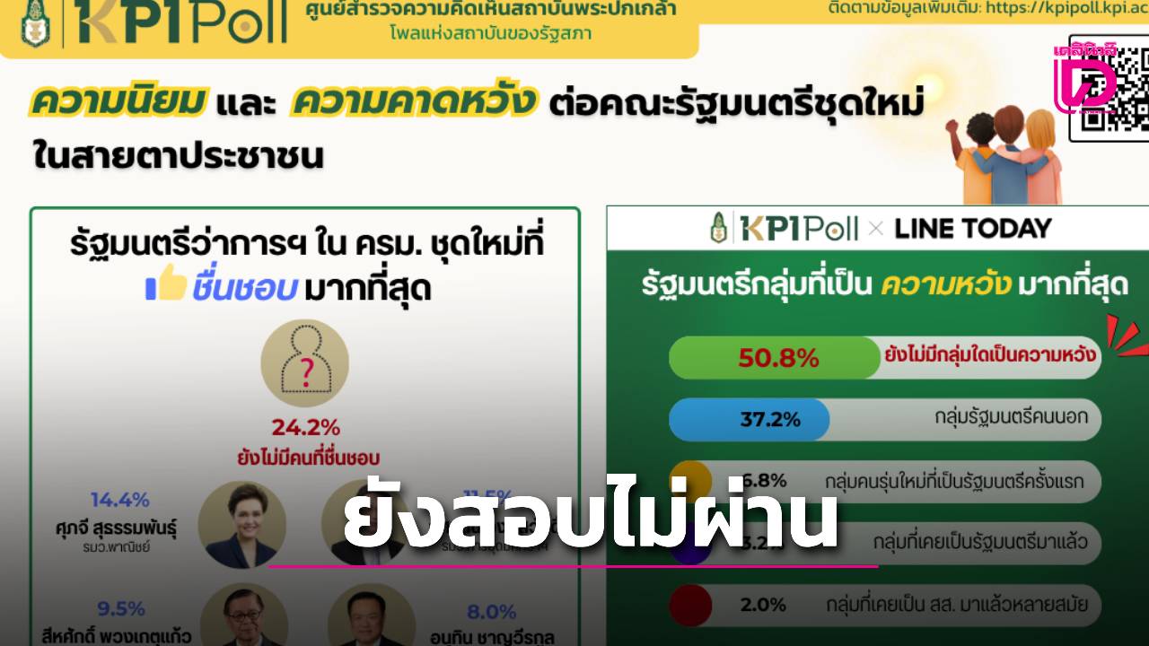 “โพลพระปกเกล้า”ชี้ ครม. ใหม่ยังสอบไม่ผ่าน! ประชาชน 50% ขอรอดูผลงานมากกว่าชื่อเสียง”.