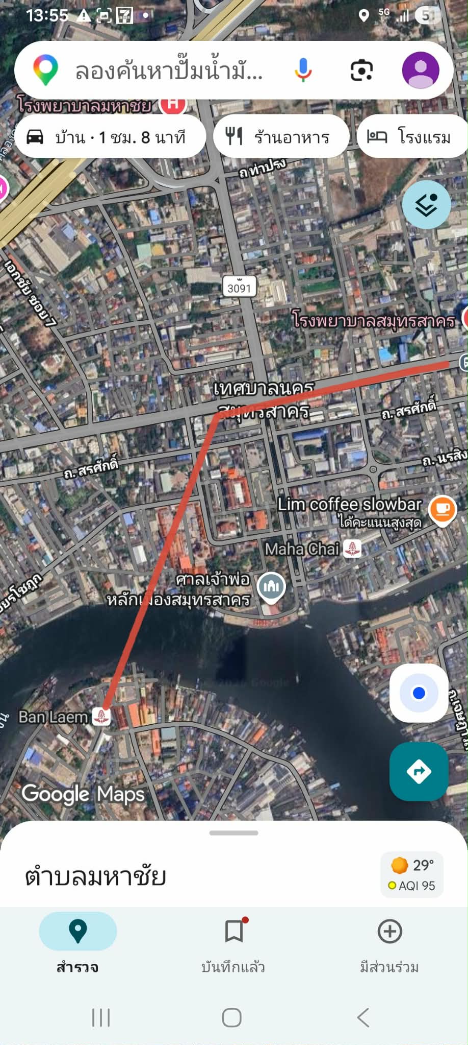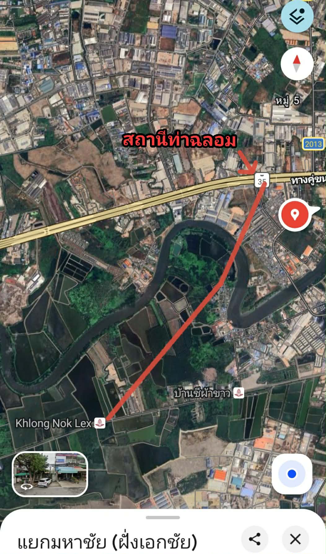 แต่เดี๋ยวก่อน การต่อขยายไปอีกฝั่งนั้น ง่ายจริงตามที่ข่าวบอกมั้ย เราก็ลองมาลากเส้นดู ซึ่งมาพอลากเส้นแล้ว ไม่น่าจะเป็นพื้นที่โล่งตามที่ข่าวบอก มีแต่ว่าจะเวนคืนที่ดินมาก เวนคืนที่ดินน้อย ถ้าตามภาพนี้ก็น่าจะเวนคืนพื้นที่แถวๆเคหะชุมชนสมุทรสาคร และกว่าที่รถไฟฟ้าวงเวียนใหญ่-มหาชัยสร้างเสร็จอีกหลายปี ปี 77 โน่น อีกฝั่งที่ข่าวบอกว่าเป็นพื้นที่โล่ง ต่อขยายเส้นทางรถไฟถึงปากท่อง่าย อาจจะกลายเป็นพื้นที่ชุมชนหนาแน่น ต่อขยายเส้นทางรถไฟยากแล้วก็ได้