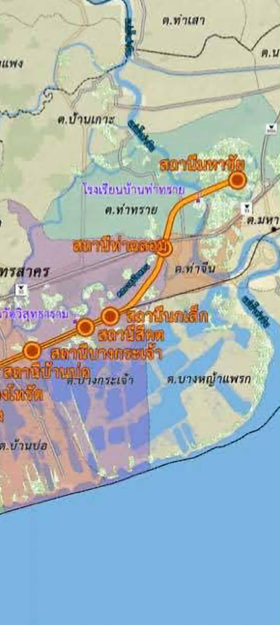 เราก็เลยมาค้นข้อมูลแผนที่การสร้างรถไฟฟ้าสายนี้ เจออย่างแผนนึง คือยกเลิกสถานีบ้านแหลมไป เป็นสถานีท่าฉลอมในภาพแทน