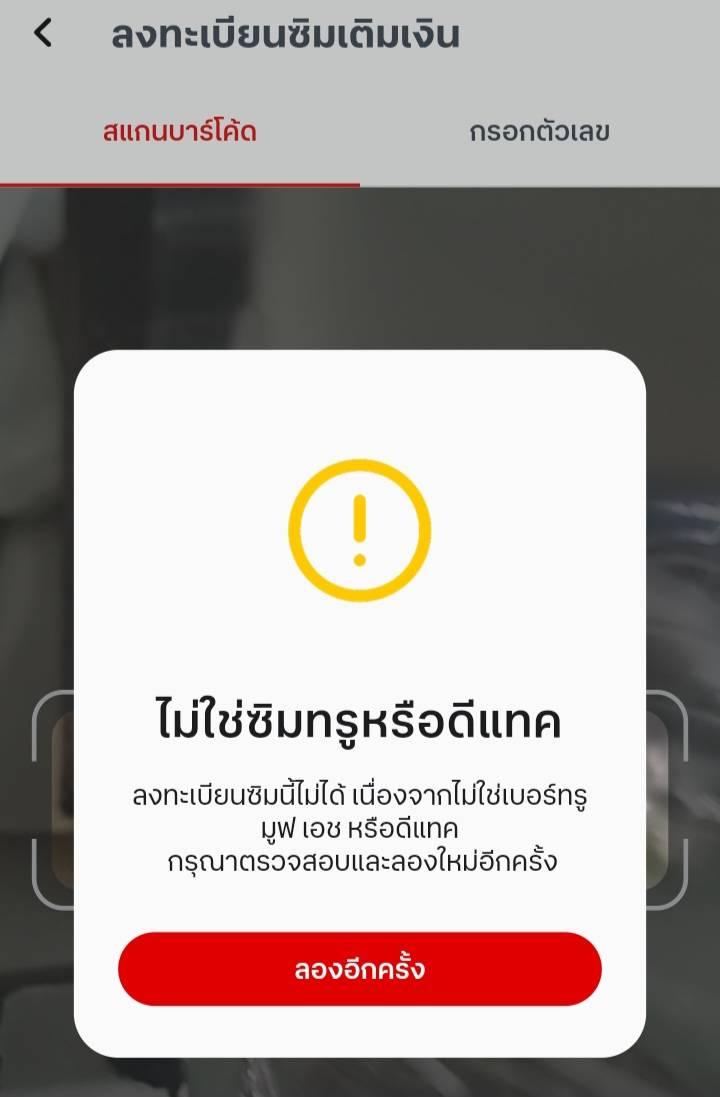 แต่..พอปรากฎจะนำมาลงทะเบียนซ้ำ ระบบขึ้นตามหน้าจอว่า ซิมนี้ไม่ได้อยู่ในระบบของทรู ทุกบริการของการใช้งานไม่สามารถทำรายการได้ แต่ลองได้วิธีเดียวคือ *1242 ซึ่งเป็นบริการเดียวที่สามารถจะใช้ได้