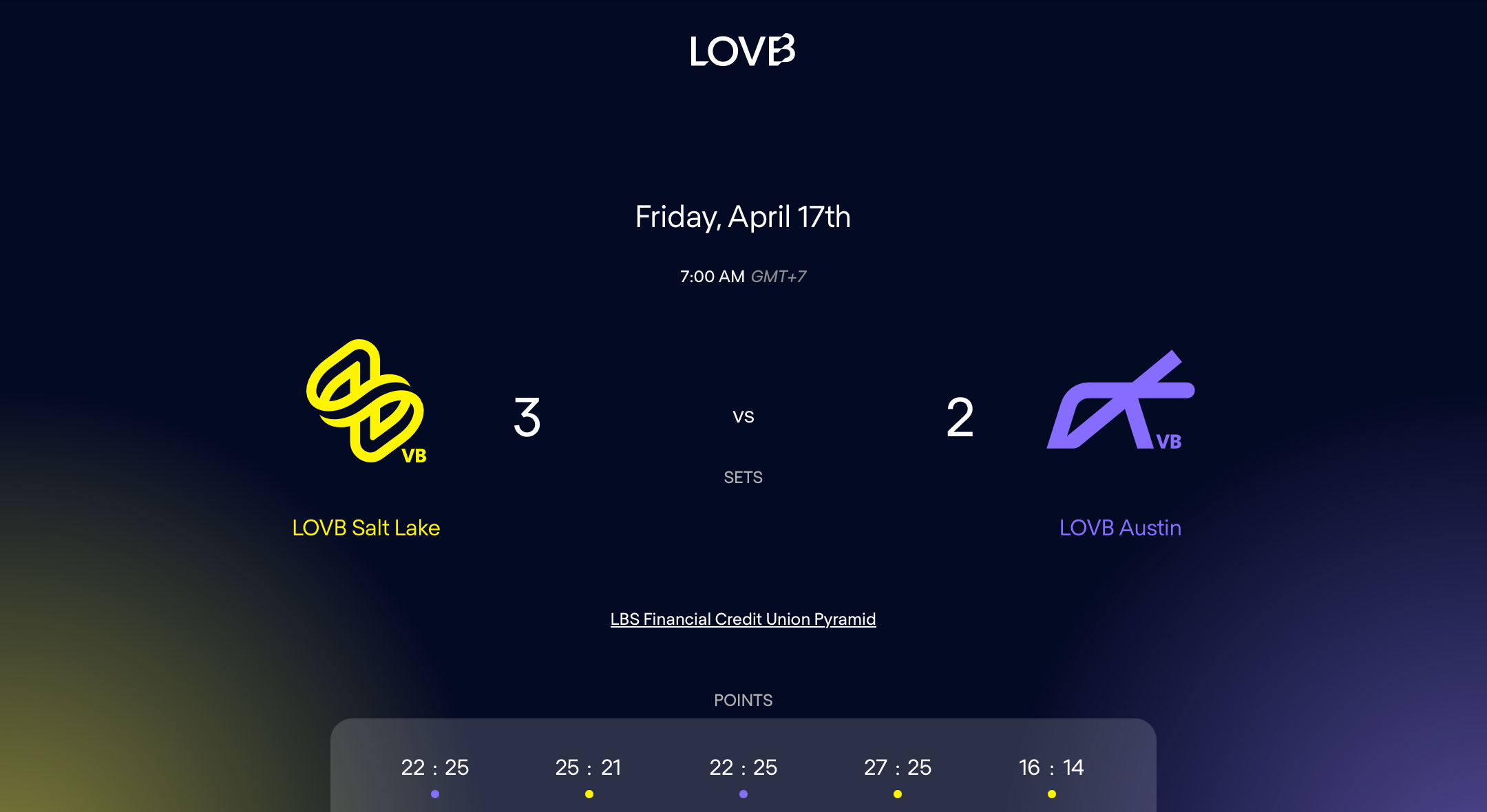 LOVB Salt Lake 3-2 LOVB Austin (22-25 5-21 22-25 27-25 16-14)