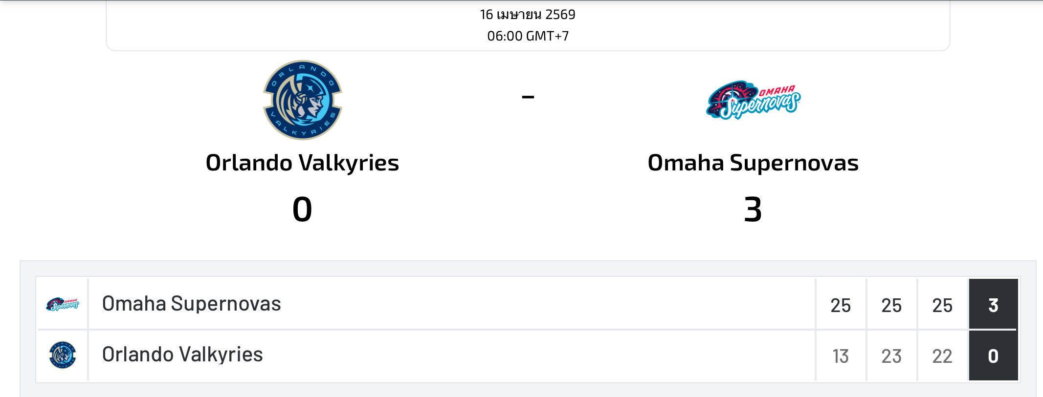 สถิติ Orlando Valkyries 0-3 Omaha Supernovas |