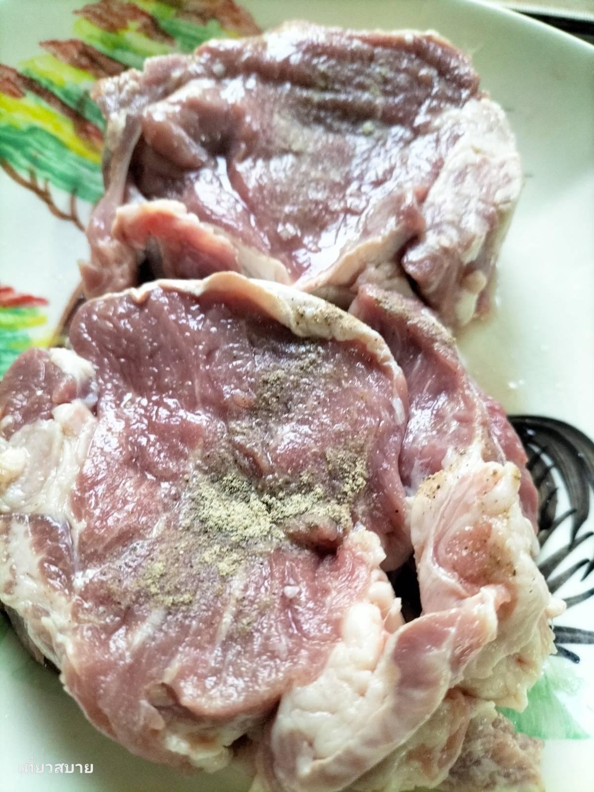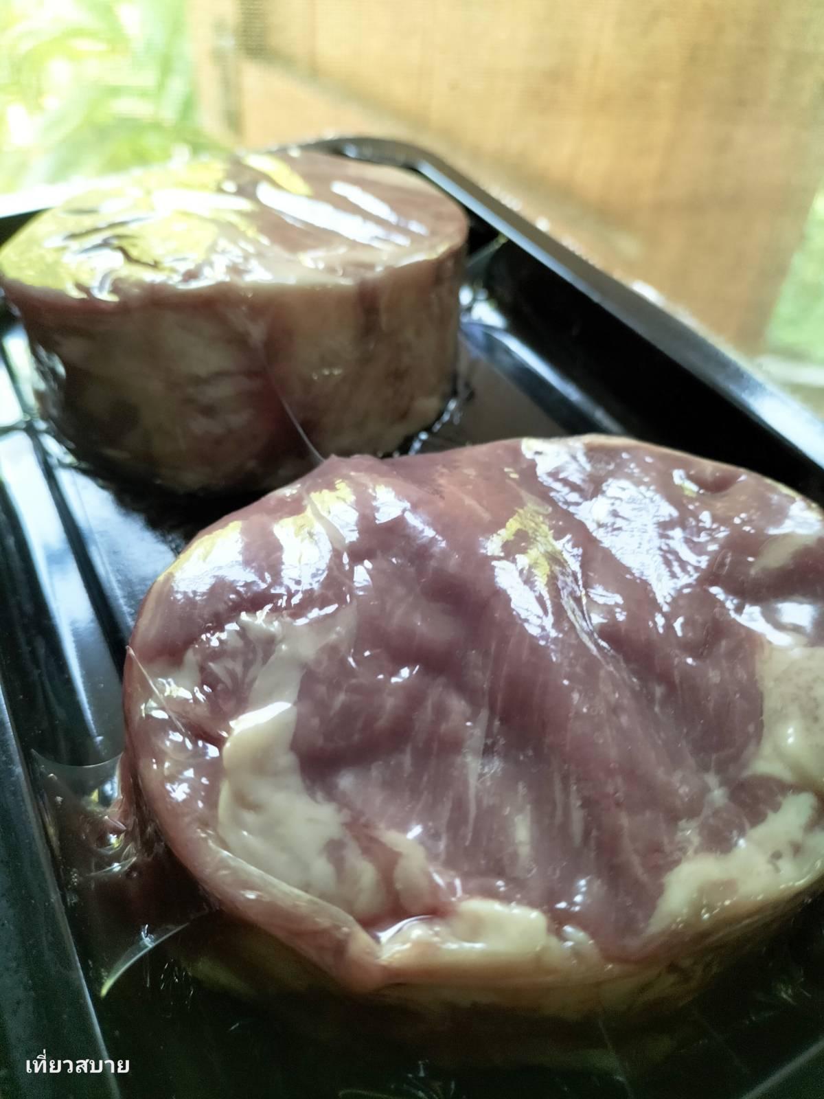 1. เนื้อสันใน ดรายเอจ นำมาหมักเกลือ พริกไทยป่น