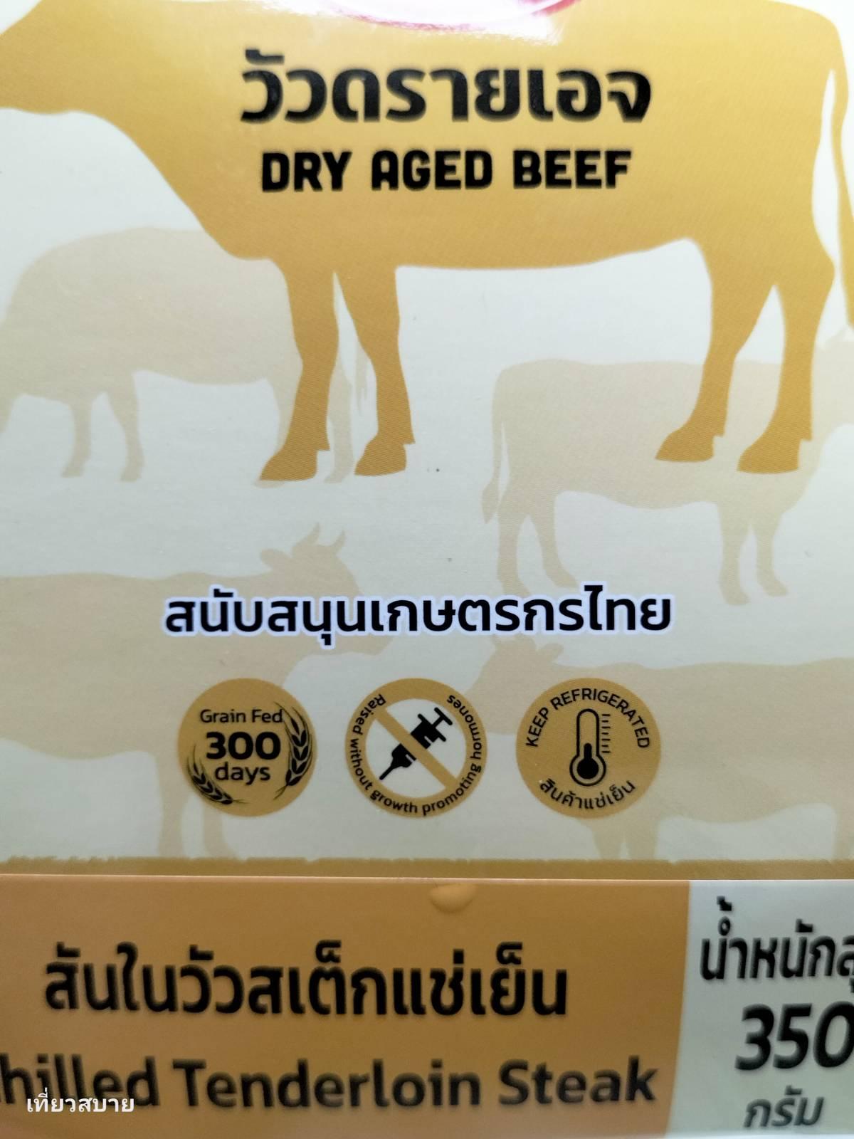 จุดเริ่มต้นคือ..ไปเดินห้างแถวบ้าน แล้วเจอเนื้อดรายเอจ ลดราคาพอดี จขกท.เลยได้ "พระเอก" ของวันนี้ พอหยิบดูแพ็คเกจแล้วยิ่งใจฟูมากค่ะ เพราะเห็นคำว่า "สนับสนุนเกษตรกรไทย" ตัวใหญ่ๆ กับ "Grain Fed 300 days ไม่ใช้ฮอร์โมน" แบบนี้ คือต้องห้ามพลาดแน่นอน