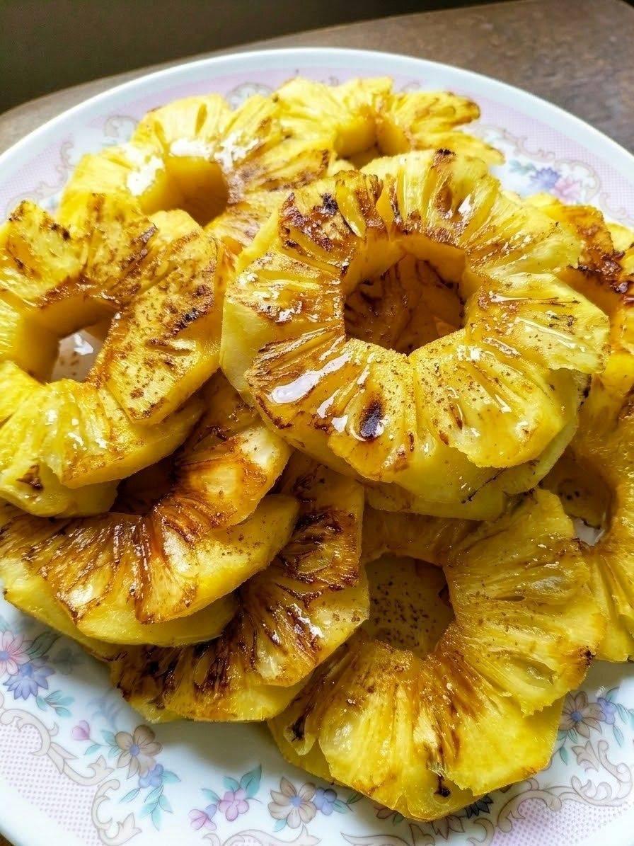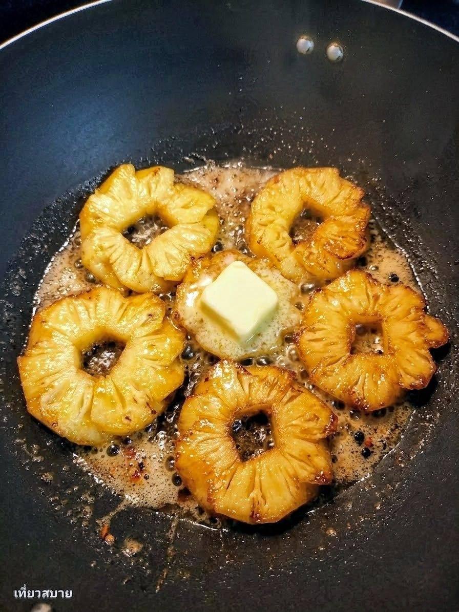 1. ย่างสับปะรด: หั่นสับปะรดชิ้นหนาประมาณ 1/2 นิ้ว นำไปย่างด้วยเนยบนกระทะ ใช้ไฟกลาง จนขึ้นลายสวยๆ จะได้กลิ่นหอมคาราเมลมากเลยค่ะ จากนั้นตักพักไว้ก่อน