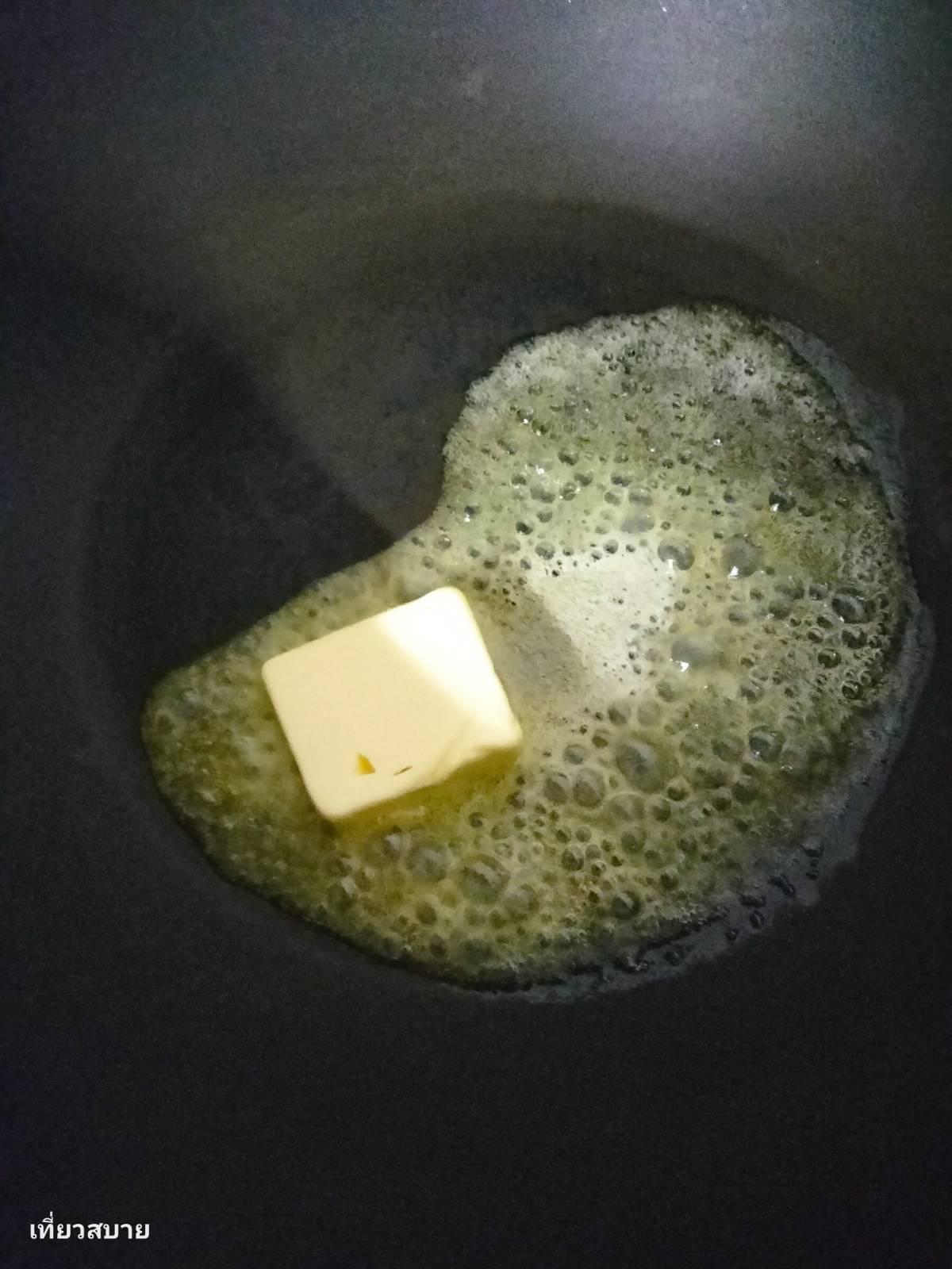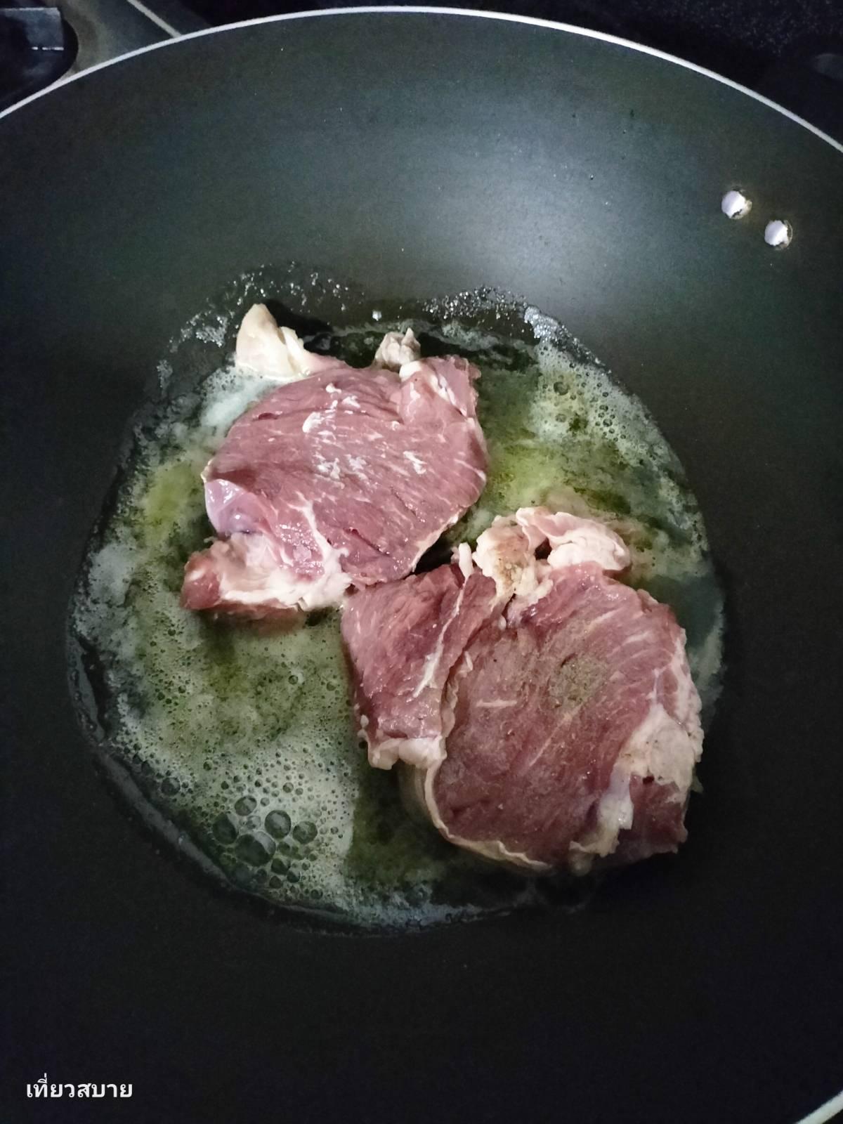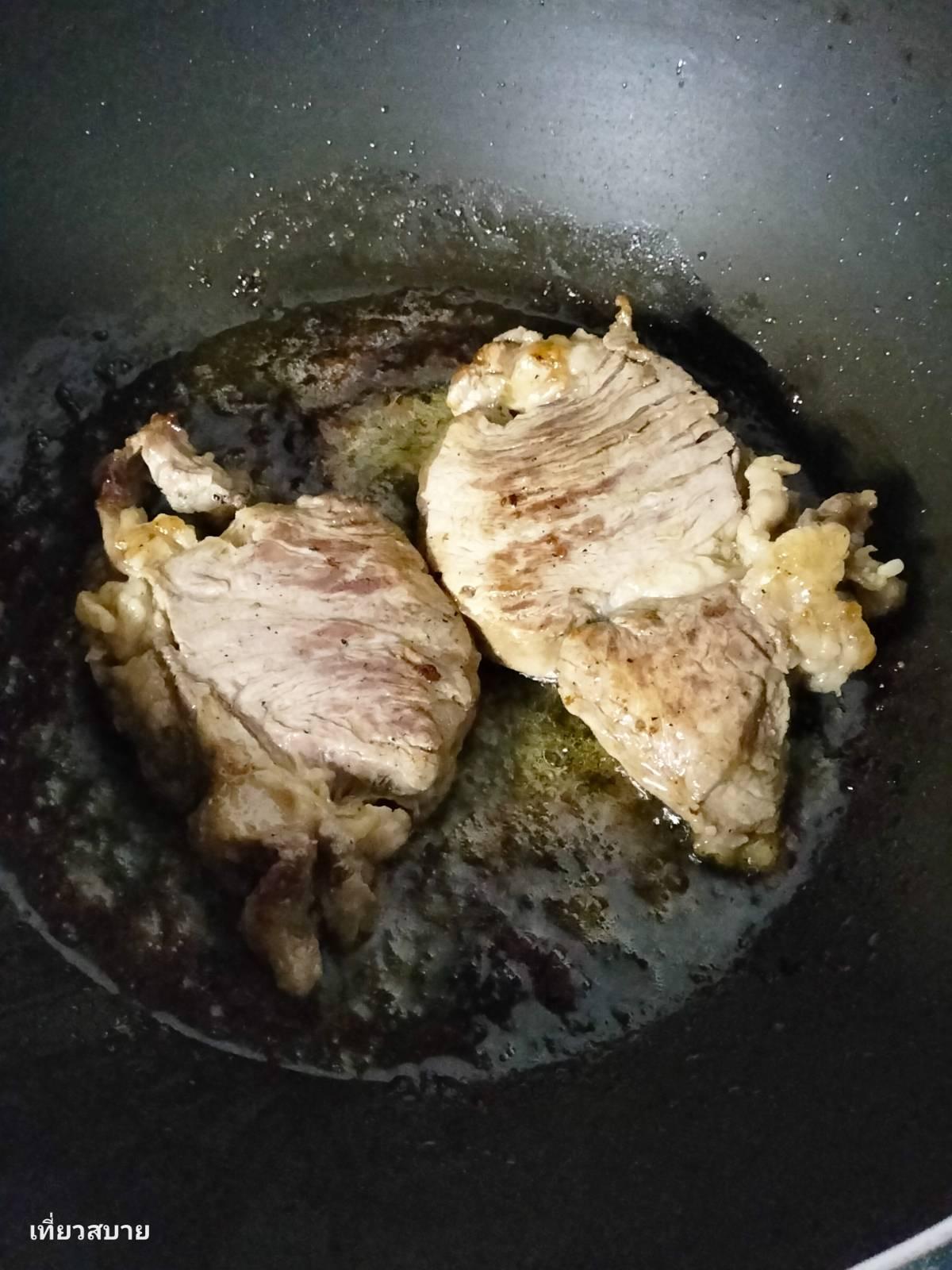 2. ย่างเนื้อ: โรยเกลือพริกไทยบนเนื้อทั้งสองด้าน ย่างด้วยเนยบนกระทะร้อนจัด ด้านละ ประมาณ 3 นาทีพอค่ะ จะได้เนื้อด้านนอกเกรียมนิดๆ แต่ข้างในยังฉ่ำๆ จากนั้น พักเนื้อไว้ 10 นาที ห้ามหั่นเลยนะคะ เดี๋ยวน้ำไหลออกหมด