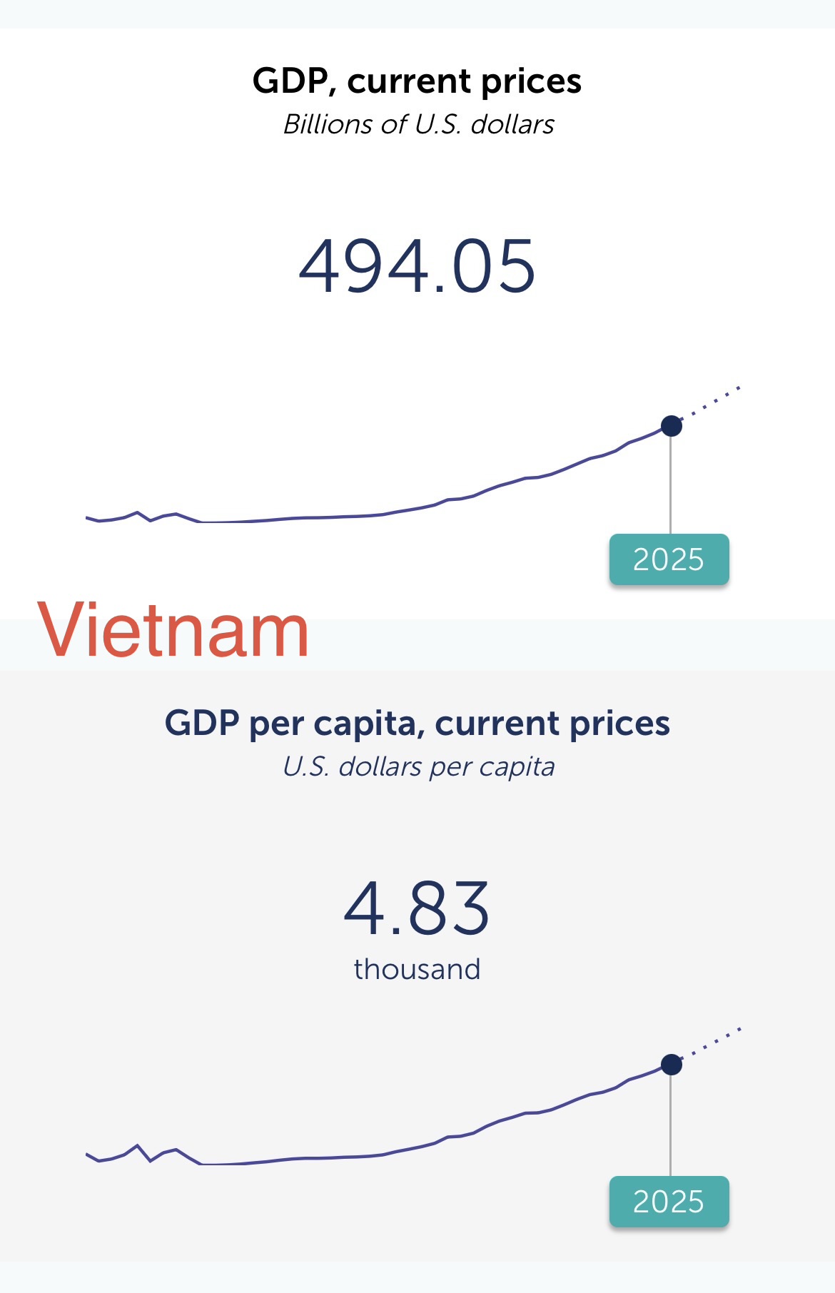 คนเวียดนามมั่นใจมากว่าปีที่แล้ว GDP รวมแซงไทยแน่ แต่ข้อมูลจาก IMF ฉบับเดือนเมษายน 2026 กลับทำให้คนเวียดนามหงอยกันหมดและไม่เชื่อ IMF เพราะยังแซงไทยไม่ได้แถมยังโดนไทยทิ้งห่างออกไปอีก ทั้งๆที่ GDP ของไทยปีที่แล้วโตแค่ 2.4% และขนาดว่า IMF คาดการณ์ GDP เวียดนามปีนี้จะโต 7.1% แต่ GDP รวมก็ยังอยู่ที่ 527 เท่านั้น ก็ยังตามไทยอยู่ดี เพราะปล่อยให้ค่าเงินด่องอ่อนค่าลงทุกปีเพื่อความได้เปรียบในการส่งออก ก็ต้องแลกมาด้วยอัตราการเพิ่ม GDP ที่น้อย จึงไม่แปลกใจที่ปีนี้เวียดนามตั้งเป้าให้ GDP โต 10% เพราะอยากแซงไทยสุดๆ 5555
