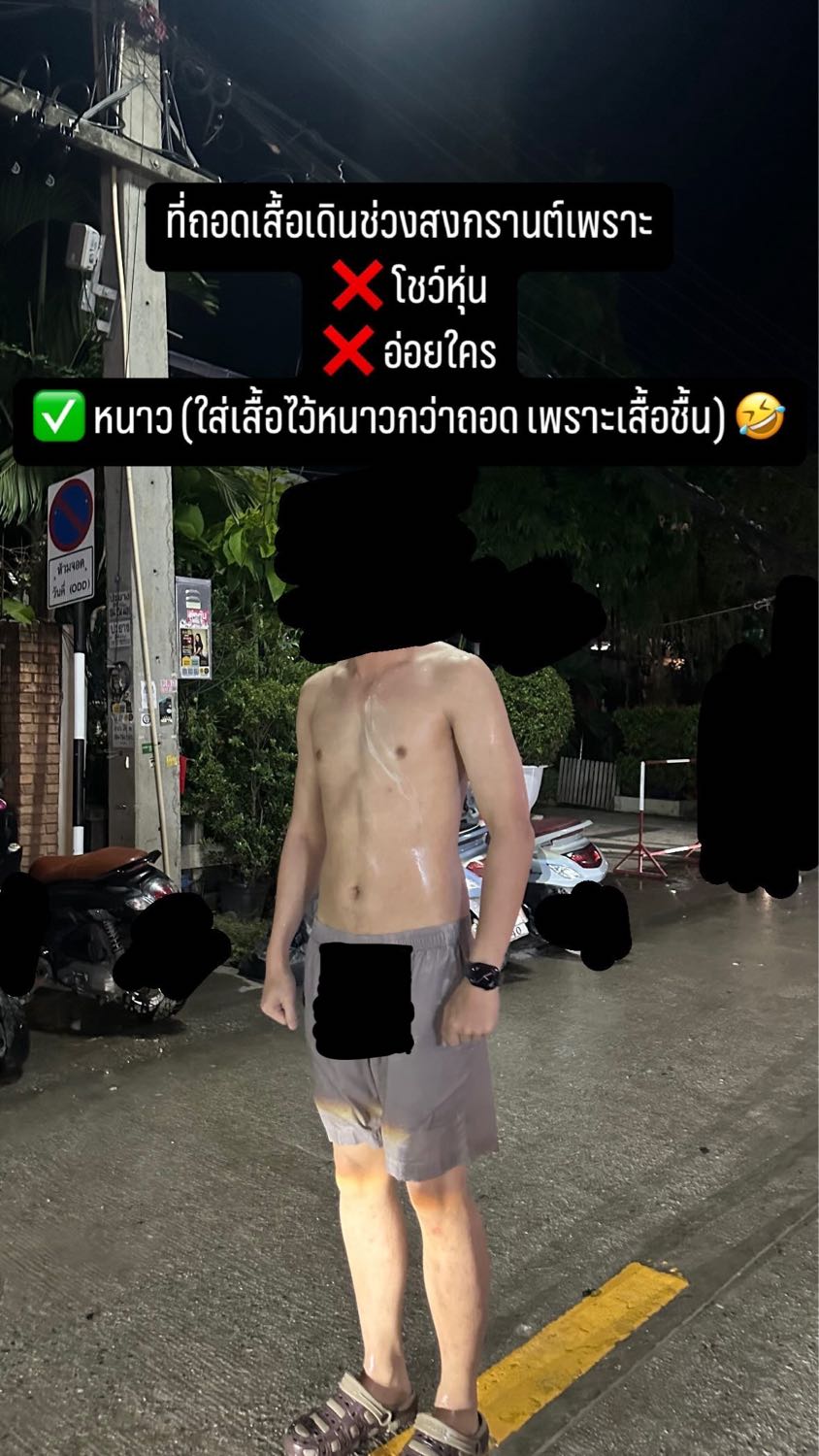 ผมเป็นคนหนึ่งที่ถอดเสื้อเล่นน้ำสงกรานต์เหมือนกันครับ แต่จะบอกว่า เหตุผลที่ถอดเสื้อนั้น ไม่ได้เป็นเพราะว่าโชว์หุ่น หรือว่าจะอ่อยใครหรอกนะครับ