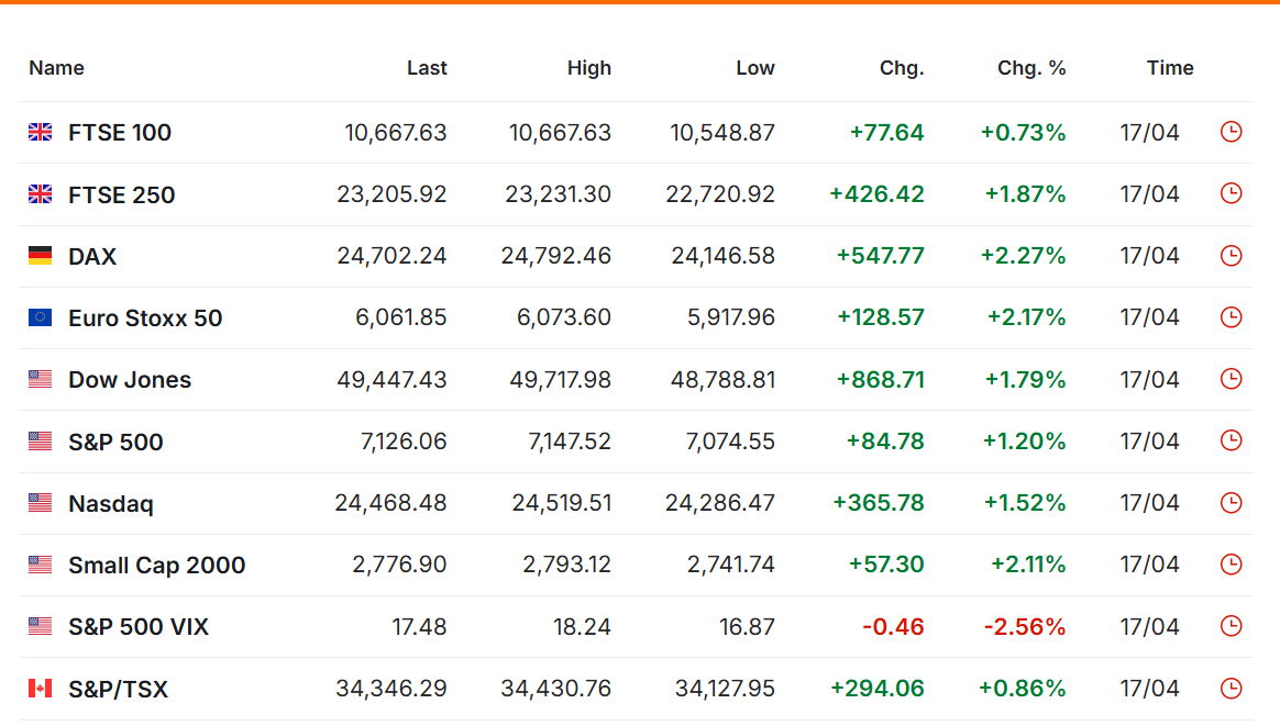 ตลาดหุ้นสหรัฐปิดบวกอย่างแข็งแกร่งในวันศุกร์ ขณะที่ราคาน้ำมันร่วงลงอย่างมาก เนื่องจากความเชื่อมั่นเพิ่มขึ้นจากสัญญาณการผ่อนคลายความตึงเครียดในตะวันออกกลางและการเปิดช่องแคบฮอร์มุซที่สำคัญเป็นการชั่วคราว