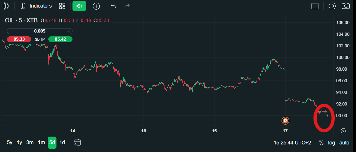 ผมแนบกราฟราคาน้ำมัน Brent จาก XTB ให้ดูประกอบ จะเห็นว่าราคาลงแรงมากในระยะสั้น สะท้อน sentiment ตลาดได้ชัดเลย
