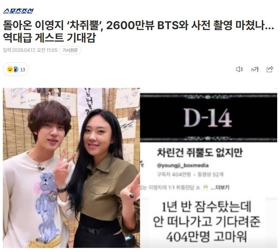 [Sports Chosun] 260417 การกลับมาของ ‘Nothing Prepared’ โดย อียองจี ยอดวิวทะลุ 26 ล้าน... จับตาไลน์อัปแขกรับเชิญสุดเทพ ท่ามกลางกระแสลือซุ่มถ่ายทำกับ BTS