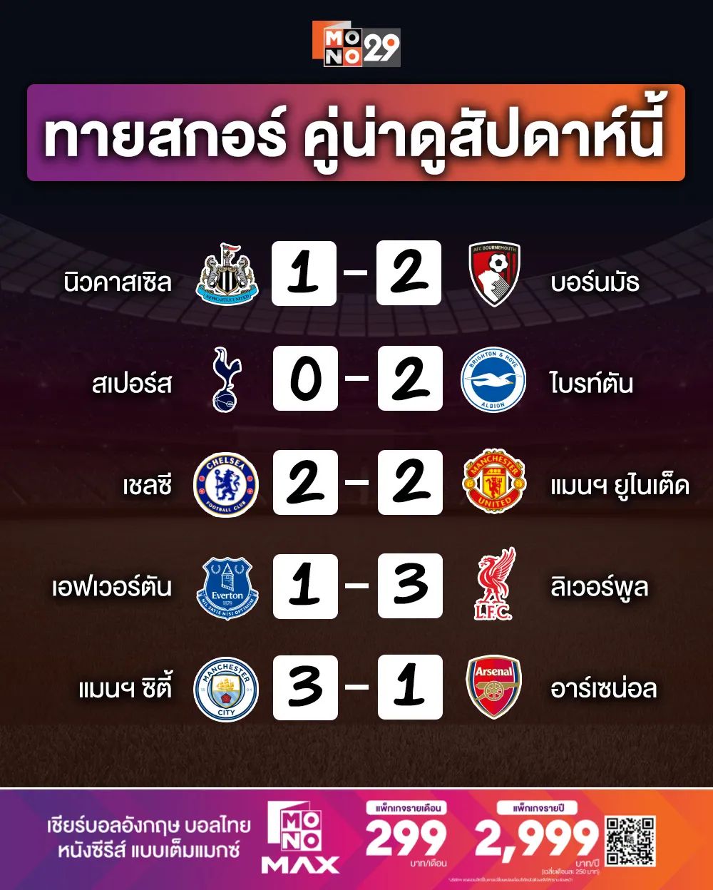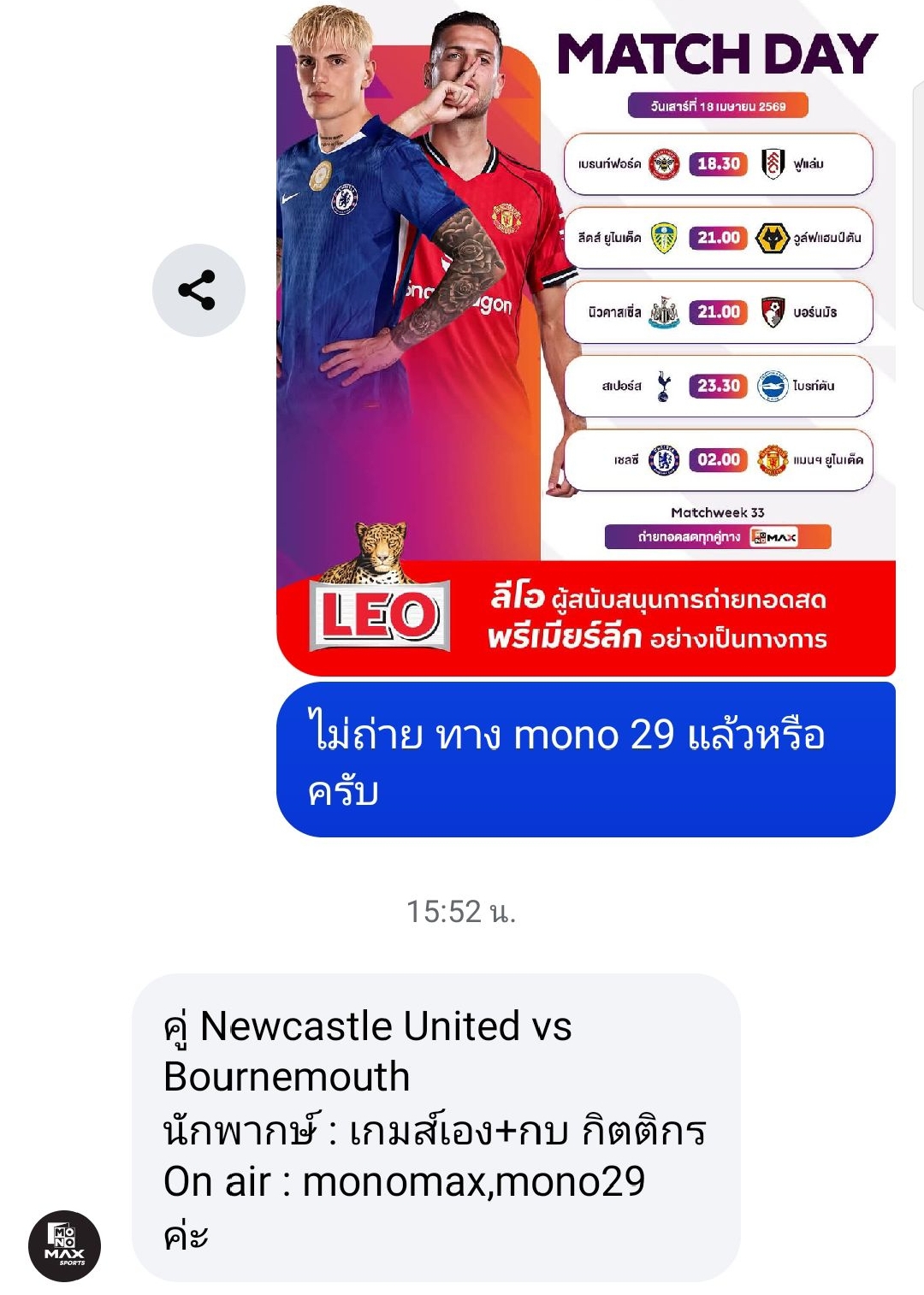ปล. Confirm คู่ นิวคาสเซิ่ล พบ บอร์นมัธ ถ่ายทางช่อง Mono 29 📺