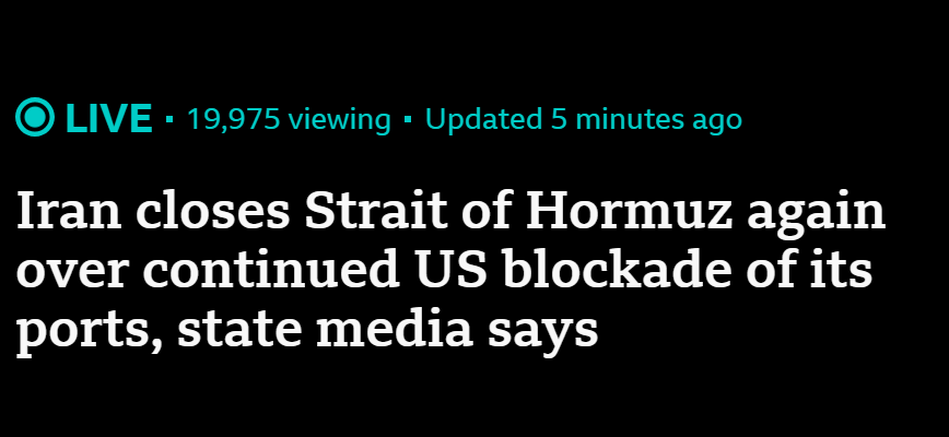 สื่อของรัฐอิหร่านรายงานว่า อิหร่านปิดช่องแคบฮอร์มุซอีกครั้ง เนื่องจากสหรัฐฯ ยังคงปิดล้อมท่าเรือของอิหร่านอย่างต่อเนื่อง