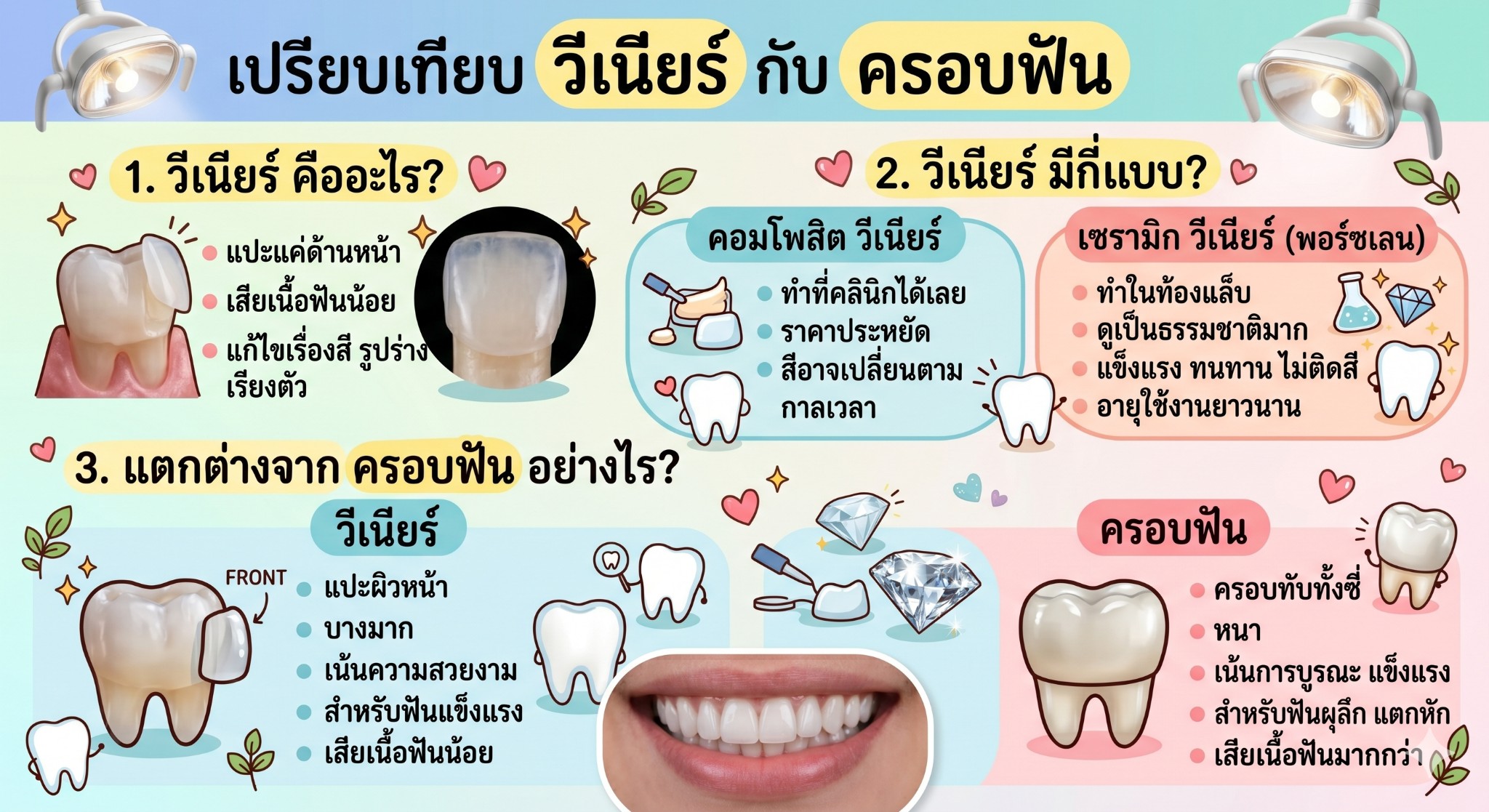 • วีเนียร์ (เน้นความสวยงาม) แปะแค่ "ผิวด้านหน้า" บางเฉียบเพียง 0.5 มม. เหมาะกับฟันที่ยังแข็งแรงดี แต่อยากแก้ปัญหาฟันเหลือง ฟันห่าง หรือฟันบิ่นเล็กน้อย