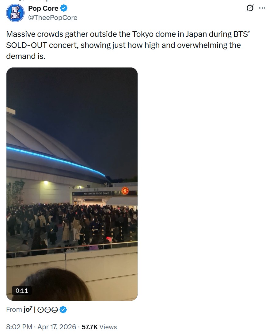 คอนเสิร์ตของ BTS จัดขึ้นที่โตเกียวโดม ญี่ปุ่น เมื่อวันที่ 17 - 18 เมษา 69 ที่ผ่านมา จำนวนขายตั๋ว Sold out อย่างรวดเร็ว และไม่พอกับความต้องการของผู้ชม จึงมีฝูงชนอีกหลายพันคน ไปรวมตัวด้านนอก เพื่อฟังเสียงและบรรยากาศในคอนเสิร์ตที่ผ่านมา