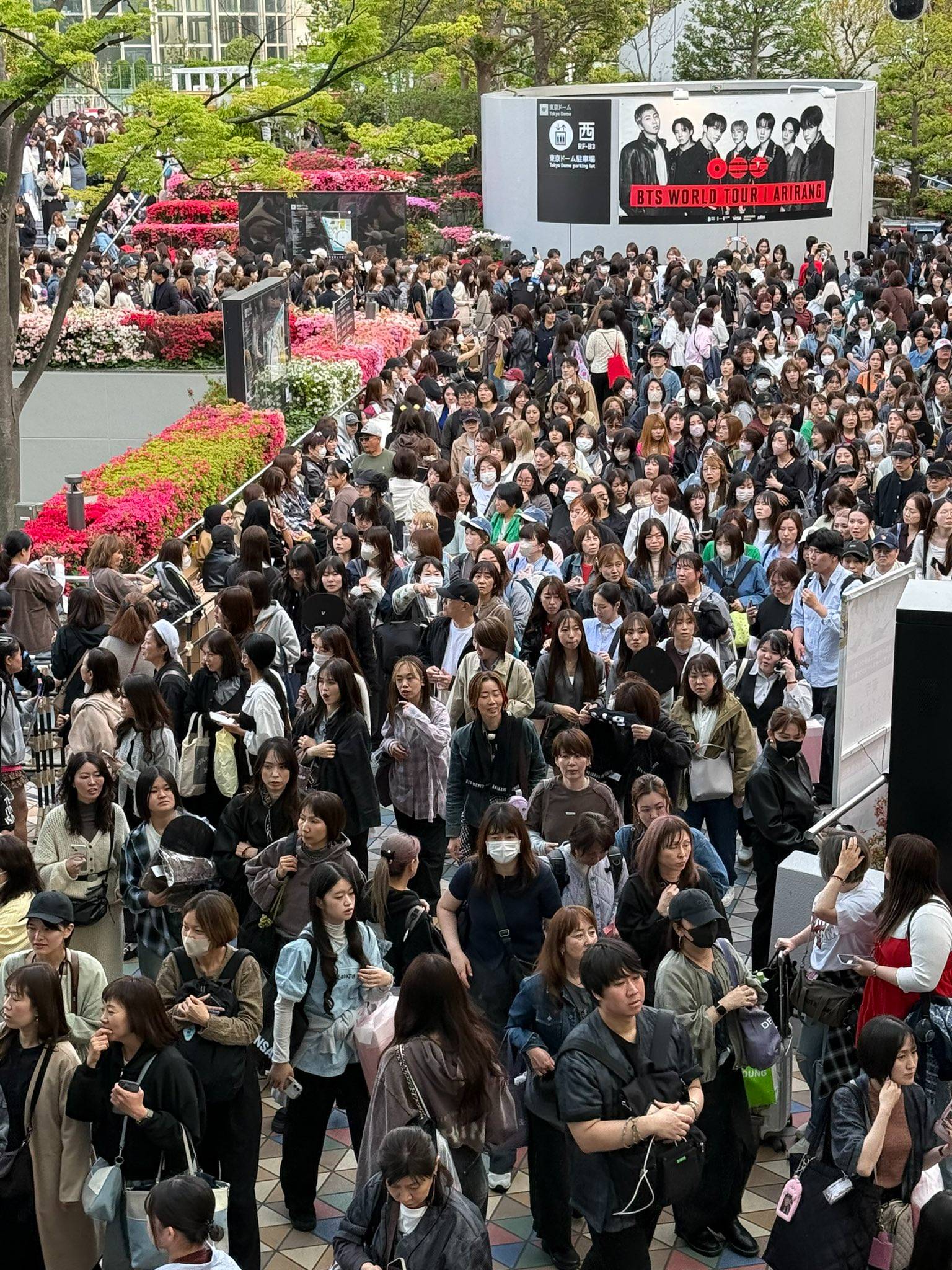 ฝูงชนจำนวนมหาศาลรวมตัวกันอยู่ที่ด้านนอกโตเกียวโดม ญี่ปุ่น ในช่วงคอนเสิร์ตที่ Sold out ของ BTS
