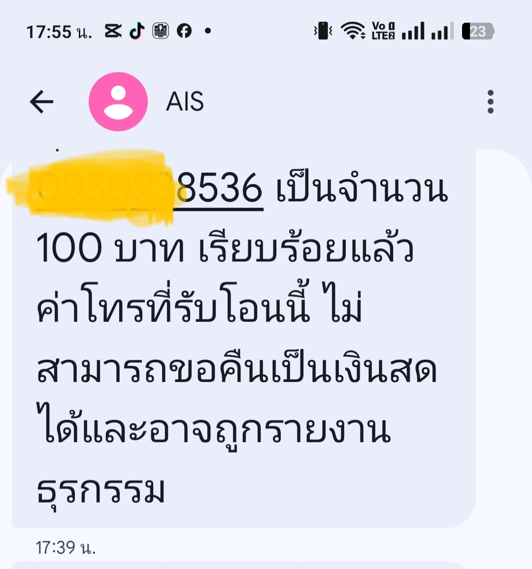 โอนเงินจาก my ais ไปอีกเบอร์ แต่ได้รับเงินไม่ครบ