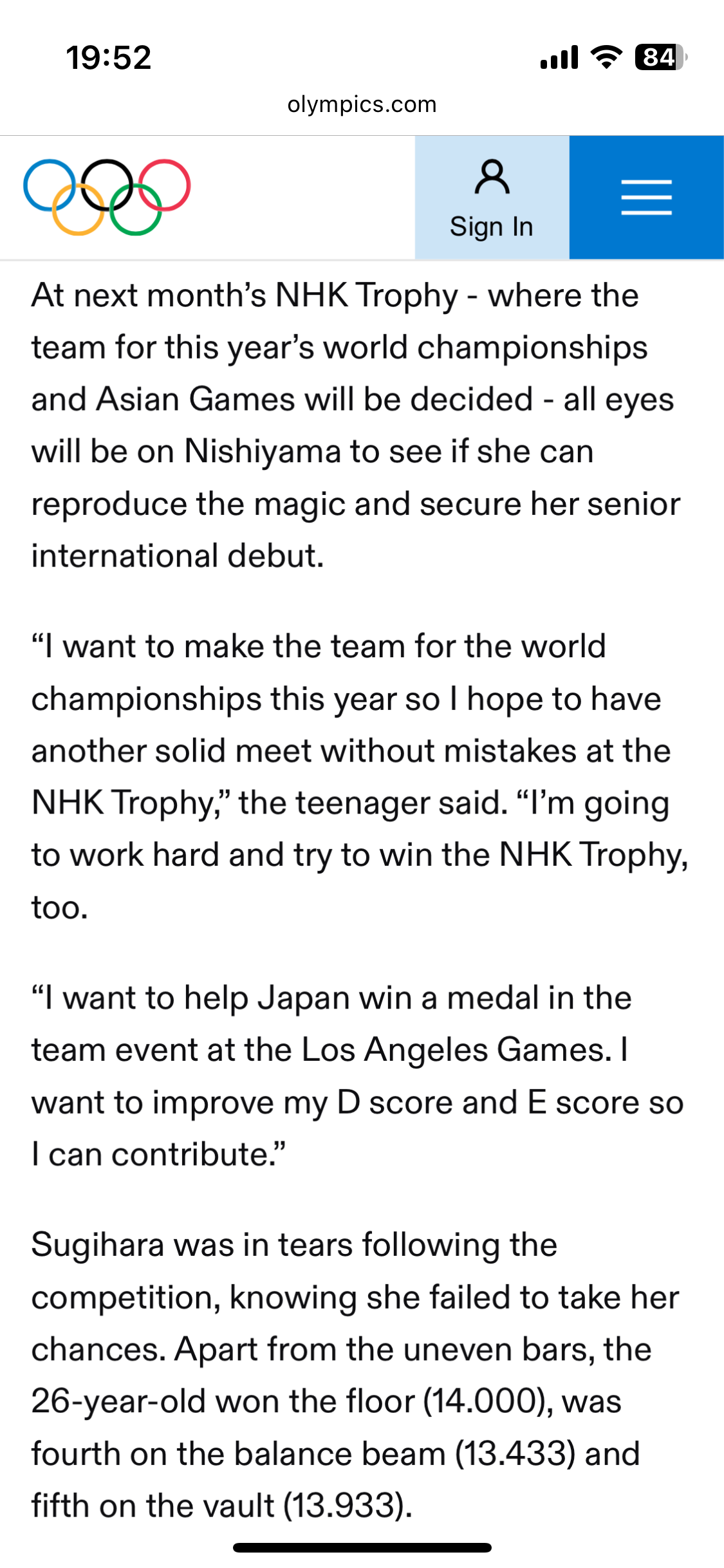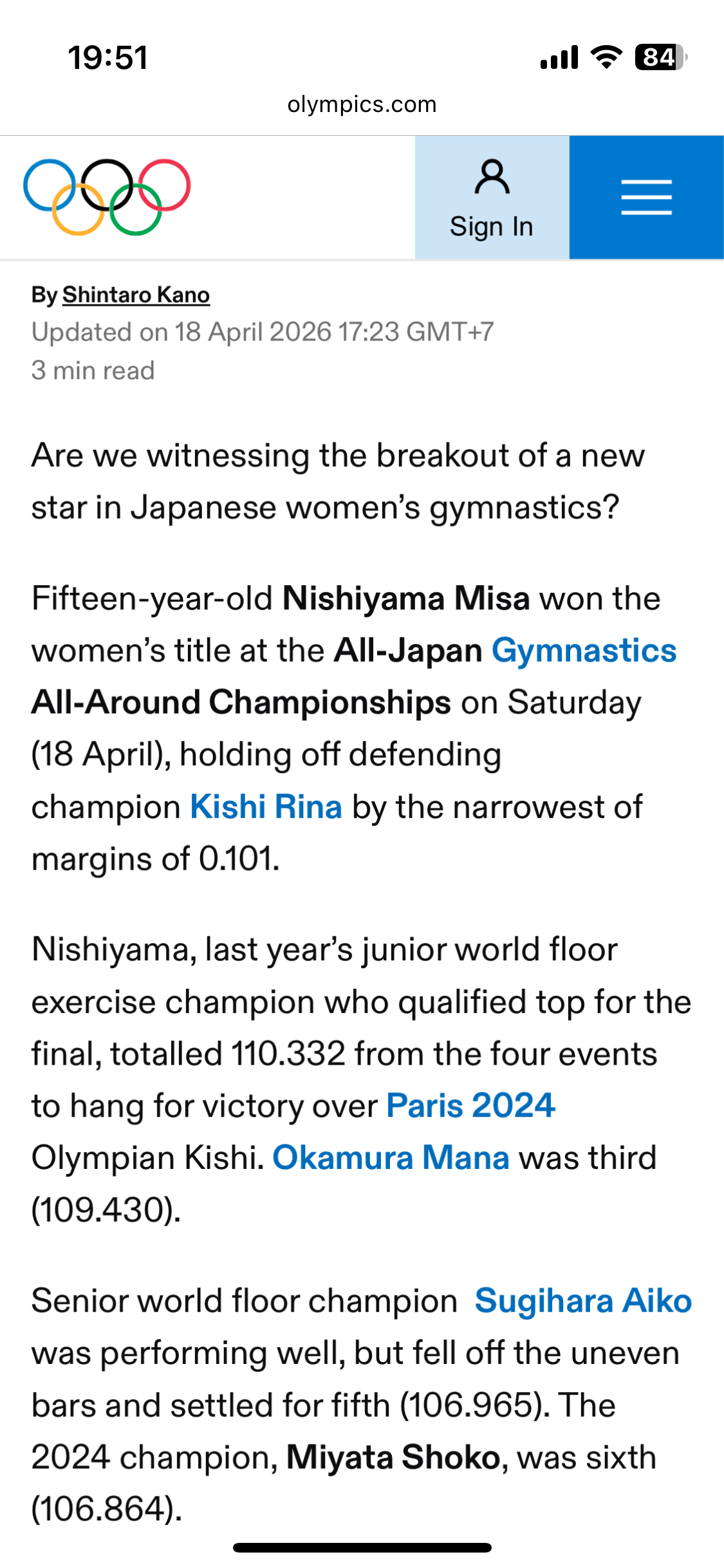 ปล. ไดกิ ฮาชิโมโตะโชว์ฟอร์มได้สมราคานักยิมนาสติกเบอร์ 1 ของโลกจริงๆครับ น้องชินจังยังเป็นรองในคะแนนความยากของท่าอยู่ก้าวหนึ่ง ถือได้ว่ารายการนี้เป็นการดวลกันระห