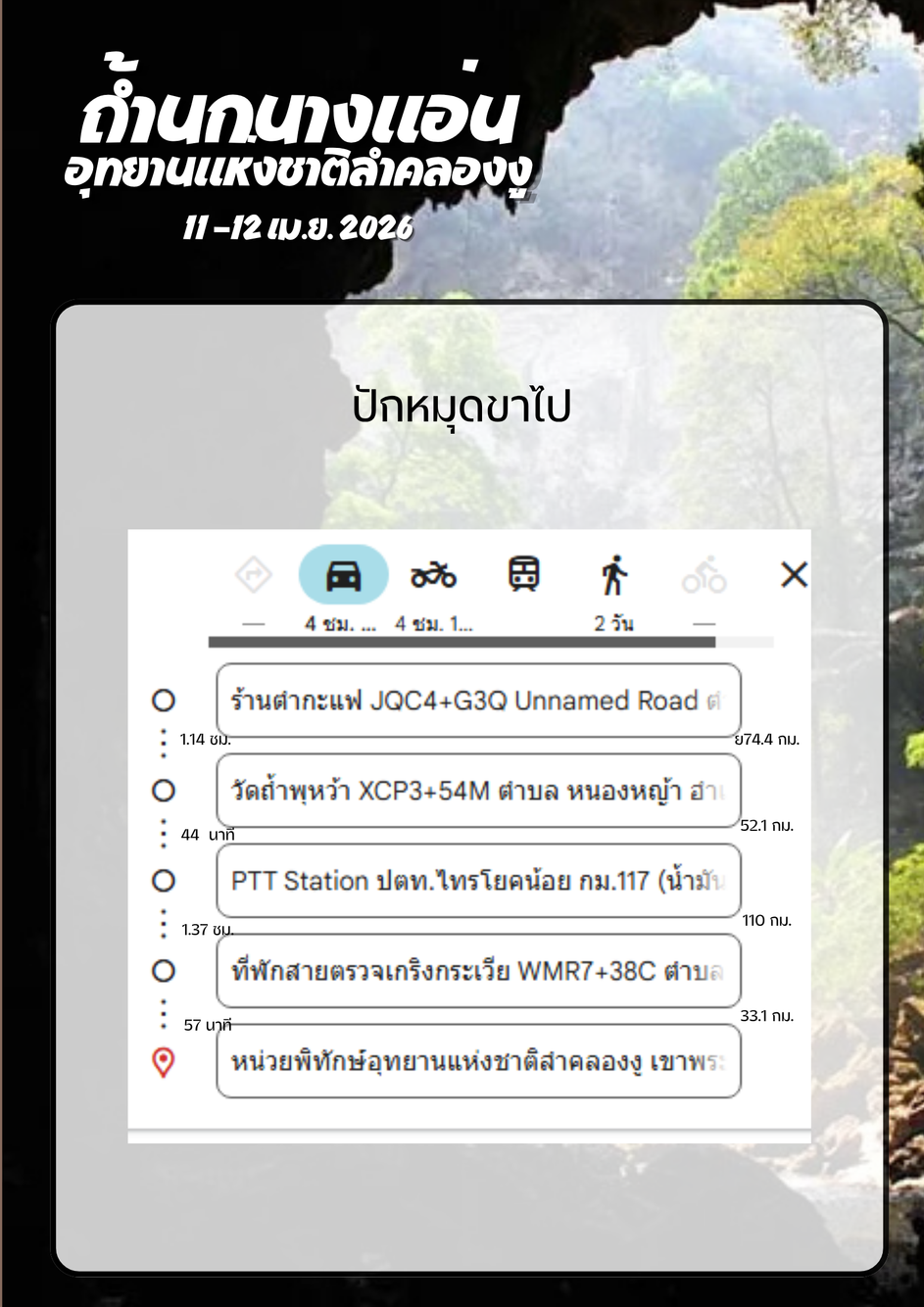 จากนั้นมุ่งหน้าตรงยาว ๆ โดยปักหมุดตามที่เจ้าหน้าที่แจ้ง เนื่องจากเส้นทางหลักใน Google map กำลังก่อสร้างถนนใหม่อยู่ ระหว่างนี้ให้ใช้เส้นทางโดยปักหมุดให้ไปผ่านที่ "ที่พักสายตรวจเกริงกระเวีย" ก่อน แล้วจึงปักต่อไปที่ "อุทยานแห่งชาติลำคลองงู" แต่ก่อนจะไปถึงอย่าลืมแวะเติมเสบียงและน้ำมันรถกันด้วย เพราะปั้มน้ำมันค่อนข้างห่างไกลกันมาก (และสถานการณ์น้ำมันยังไม่แน่นอน เติมเต็มถังไว้ก่อน)