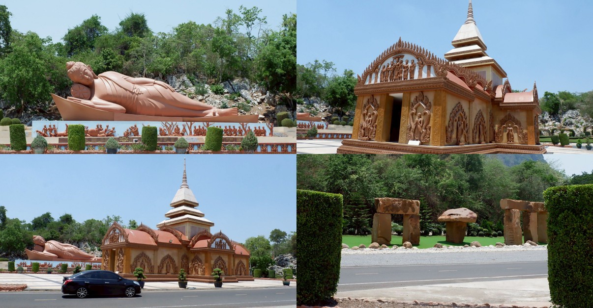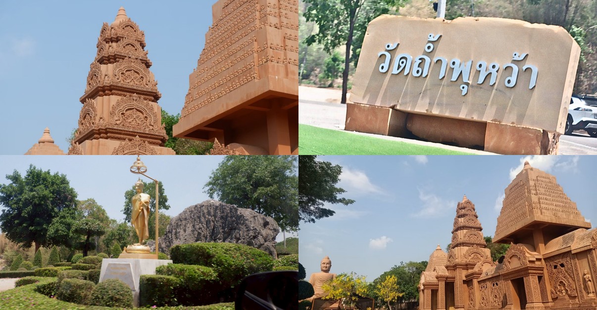 ระหว่างทางพวกเราแวะไหว้พระที่ "วัดถ้ำพุหว้า" เป็นวัดที่อยู่ภายในถ้ำที่มีลักษณะเป็นห้องโถงขนาดใหญ่ หน้าถ้ำจะมีปราสาทหินทราย เป็นรูปแบบของศิลปะขอมโบราณประยุกต์ขนาดใหญ่สีน้ำตาลแดง มีลวดลายประณีตที่สวยงาม บรรยากาศรอบโดยวัด จะมีภูเขาและป่าไม้ล้อมรอบ มีความร่มรื่น และจัดระเบียบได้สวยงามลงตัว