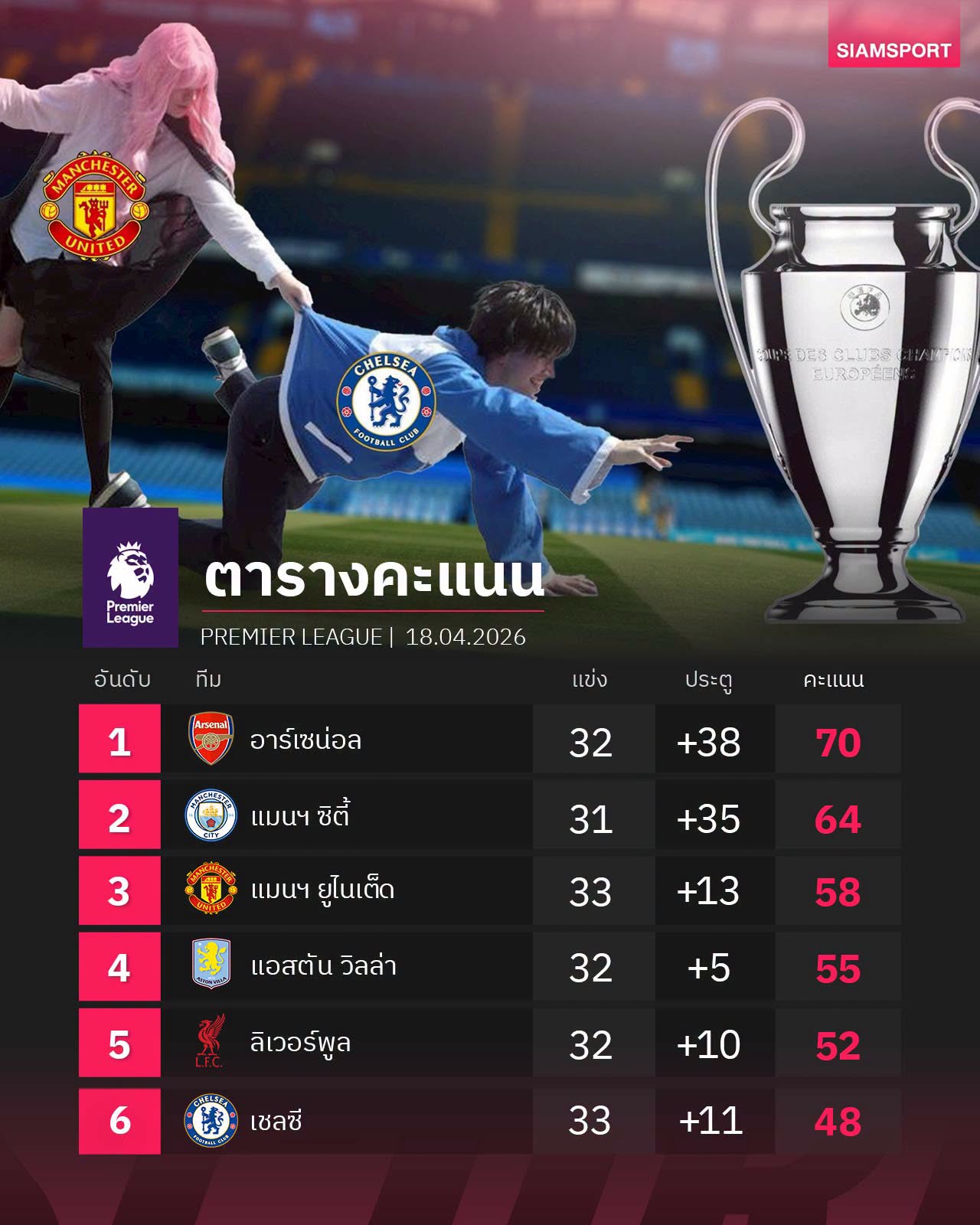 อัปเดตท็อป 6 พรีเมียร์ลีก 19/04/2569