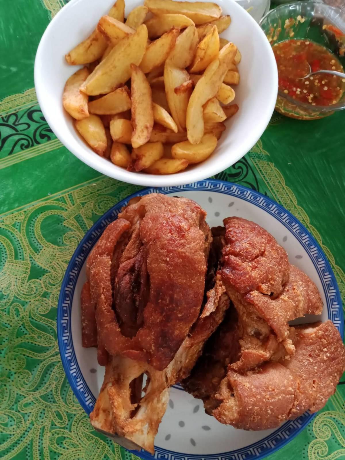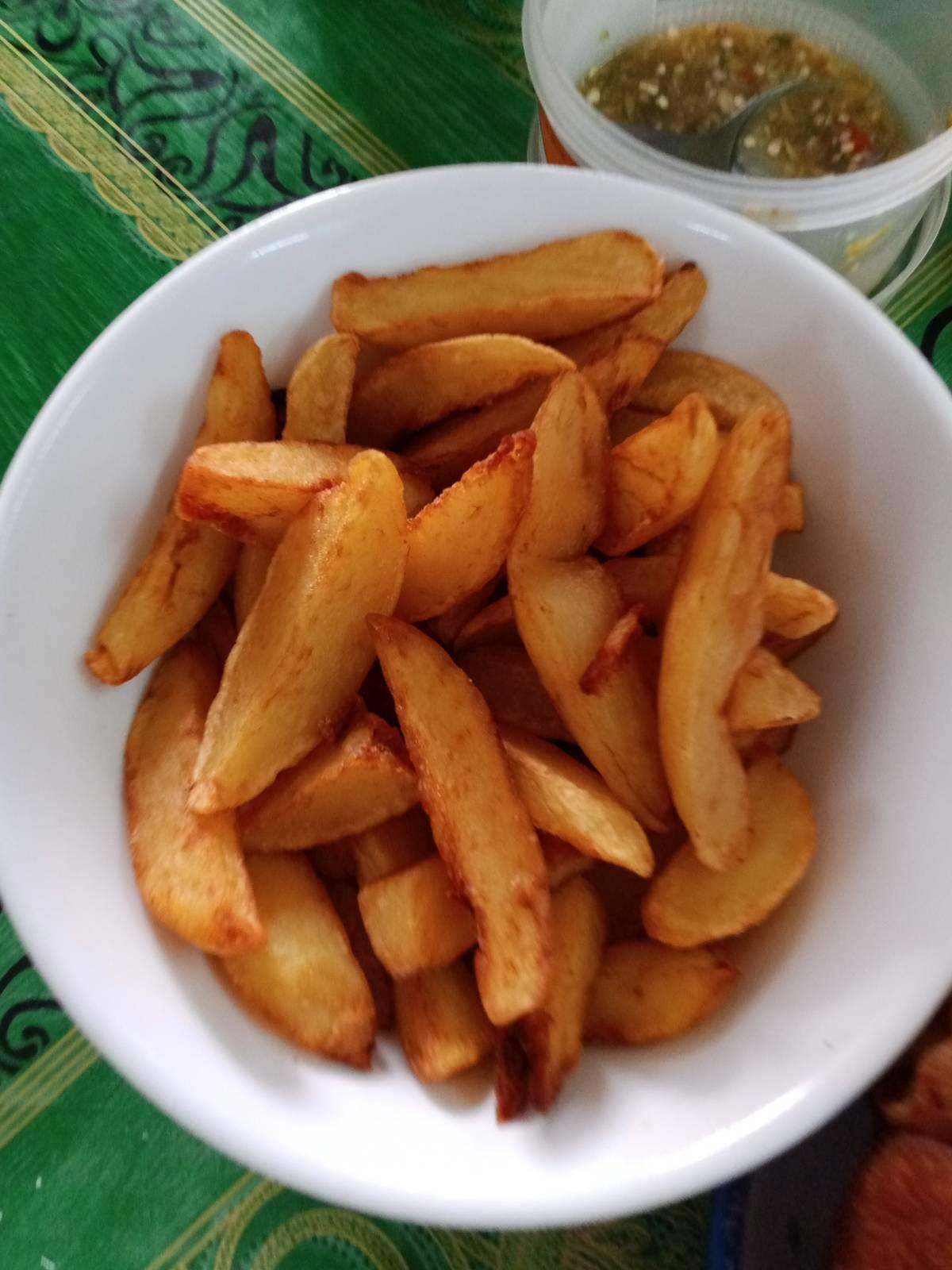 เจ๊ผมทำ Frites ด้วยล่ะ ไม่ได้ทอดกรอบ ๆ แบบ French Fries ก็เอามันฝรั่งไปต้มก่อน แล้วทอดให้พอเหลือง ๆ แค่นั้น