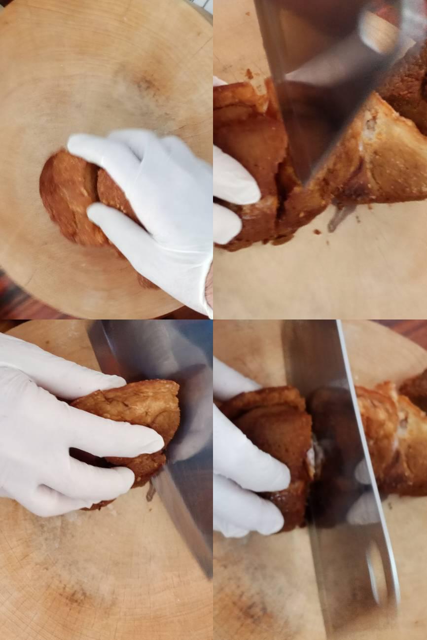 จากนั้นตักน้ำมันร้อน ๆ ราดไปบนขาหมู ค่อย ๆ ตักราดแบบนี้ไปเรื่อย ๆ จนหนังฟูทั่ว