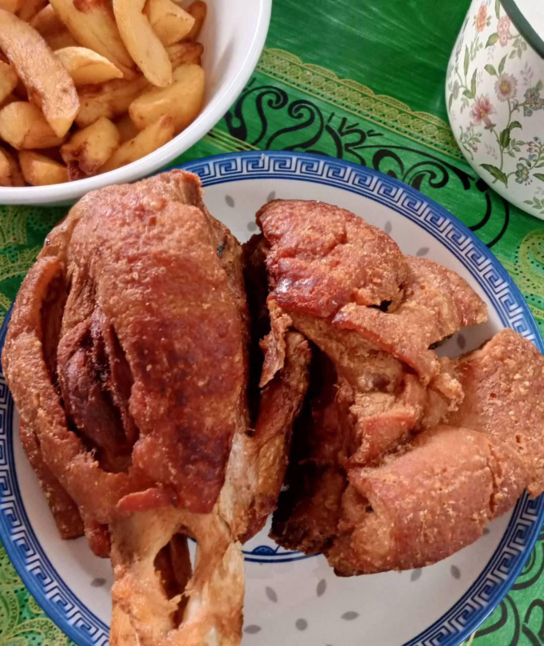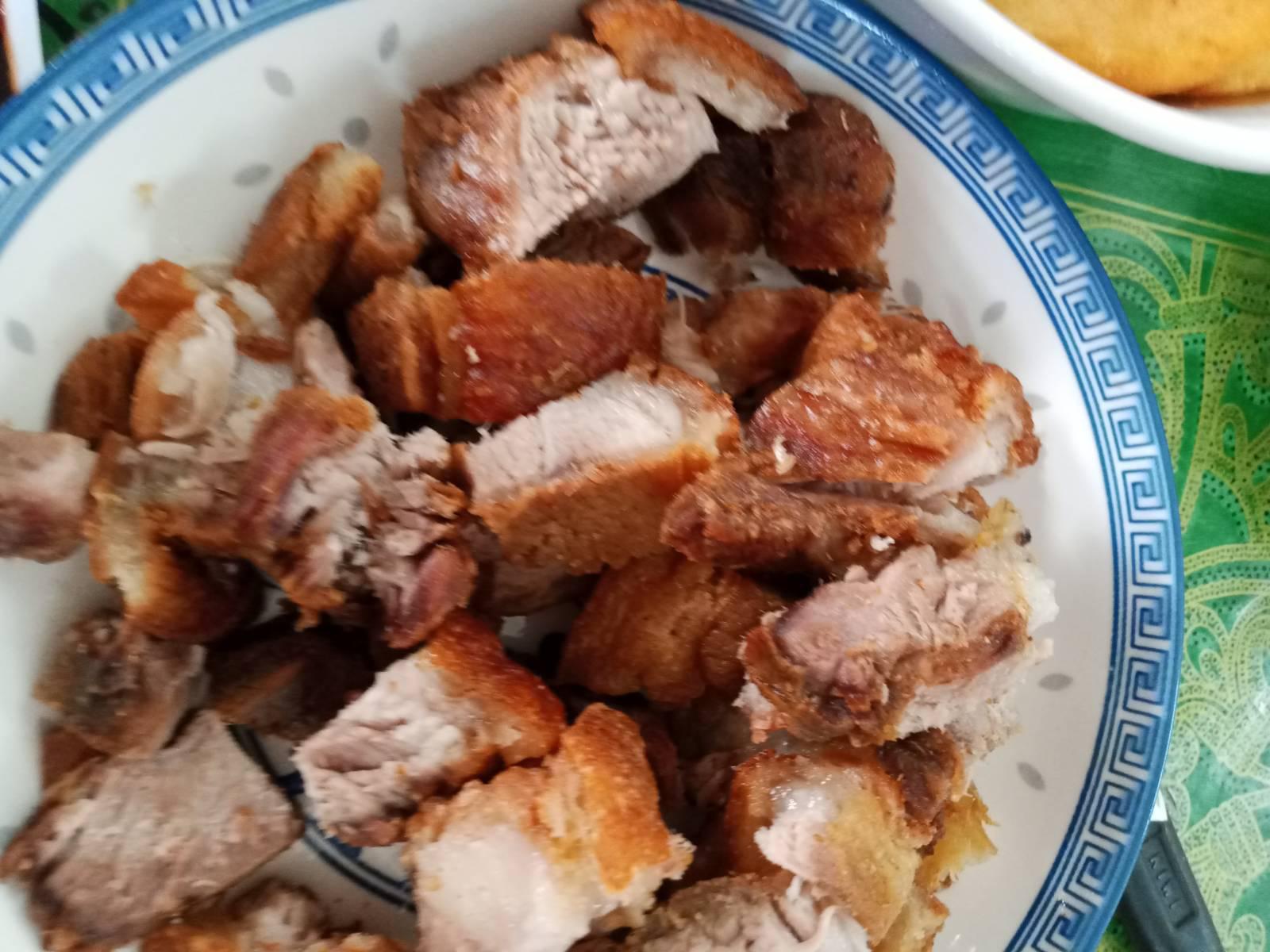 ก็จะพักให้ขาหมูเย็นตัวอีกที และเอาลงไปทอดรอบ 2 คราวนี้จะได้หนังที่กรอบ เนื้อข้างในนุ่มฉ่ำ