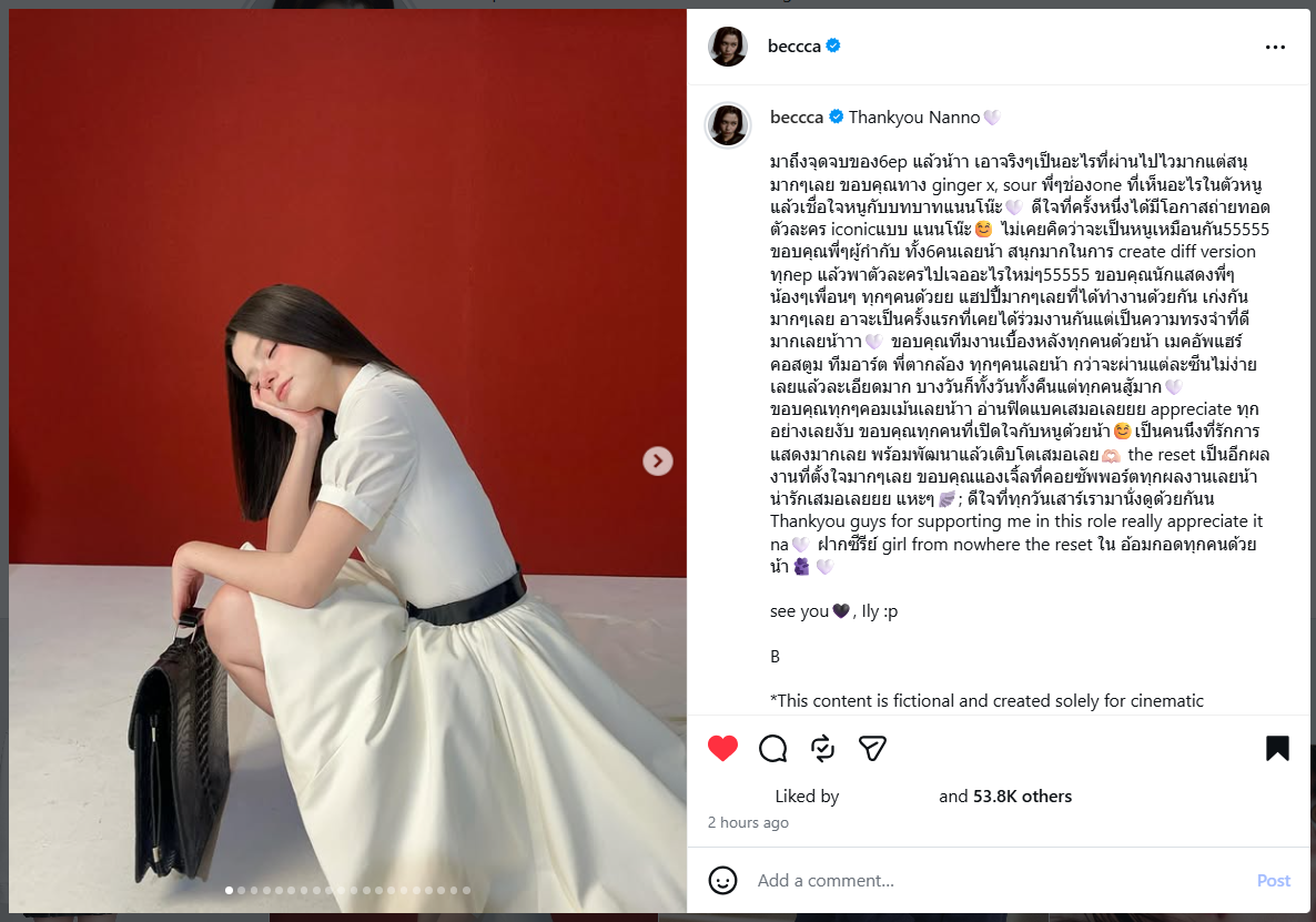 จบลงไปแล้วสำหรับ Girl from Nowhere: The Reset เบ็คกี้เลยออกมาขอบคุณทีมงานและขอบคุณทุกเสียงตอบรับที่มีต่อเธอสำหรับการแสดงในบทแนนโน๊ะ โดยลงโพสต์ใน IG ไว้ดังนี้