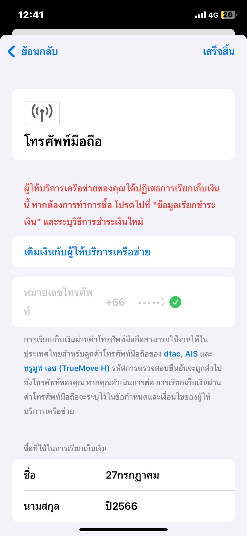 พอจะซื้อของหรือทำอะไรโดยใช้เบอร์มันจะขึ้น ผู้ให้บิการเครือข่ายของคุณได้ปฏิเสธการเรียกเก็บเงินนี้ หากต้องการทำการซื้อ โปรดไปที่"ข้อมูลเรียกชำระเงิน" แล