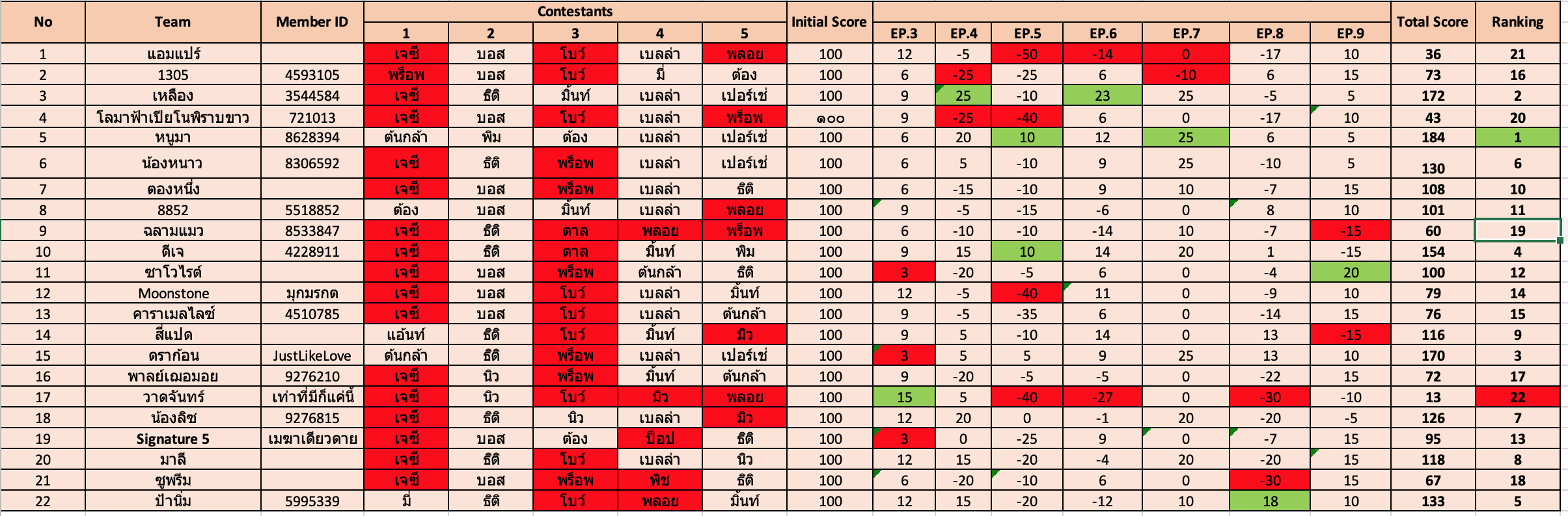 ทีมอันดับหนึ่งไม่สั่นคลอนเลยคือเมนเทอร์หนูมา ไม่โดนตัดทีมเดียวสวยๆ ยังครบห้าคน คะแนนรวมสูงสุด ตาถึงมากกกกก ไม่เคยติดลบด้วยยย