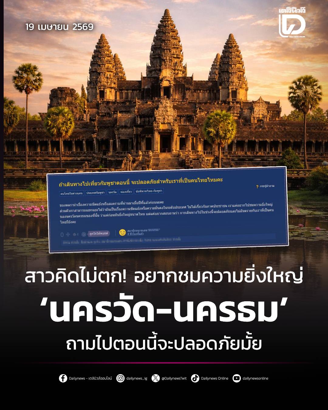 หญิงสาวตั้งกระทู้ถามผ่านเว็บดังพันทิป อยากเดินทางไปชมความยิ่งใหญ่ของนครวัด-นครธม แต่ถ้าไปตอนนี้จะปลอดภัยไหม?
