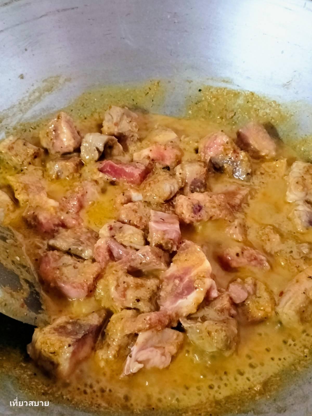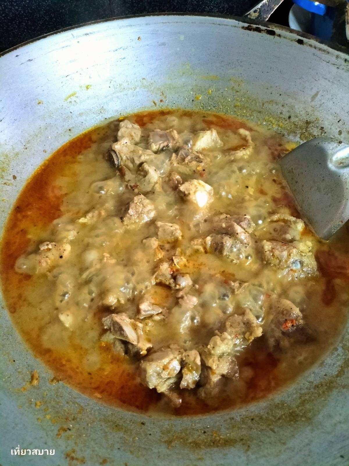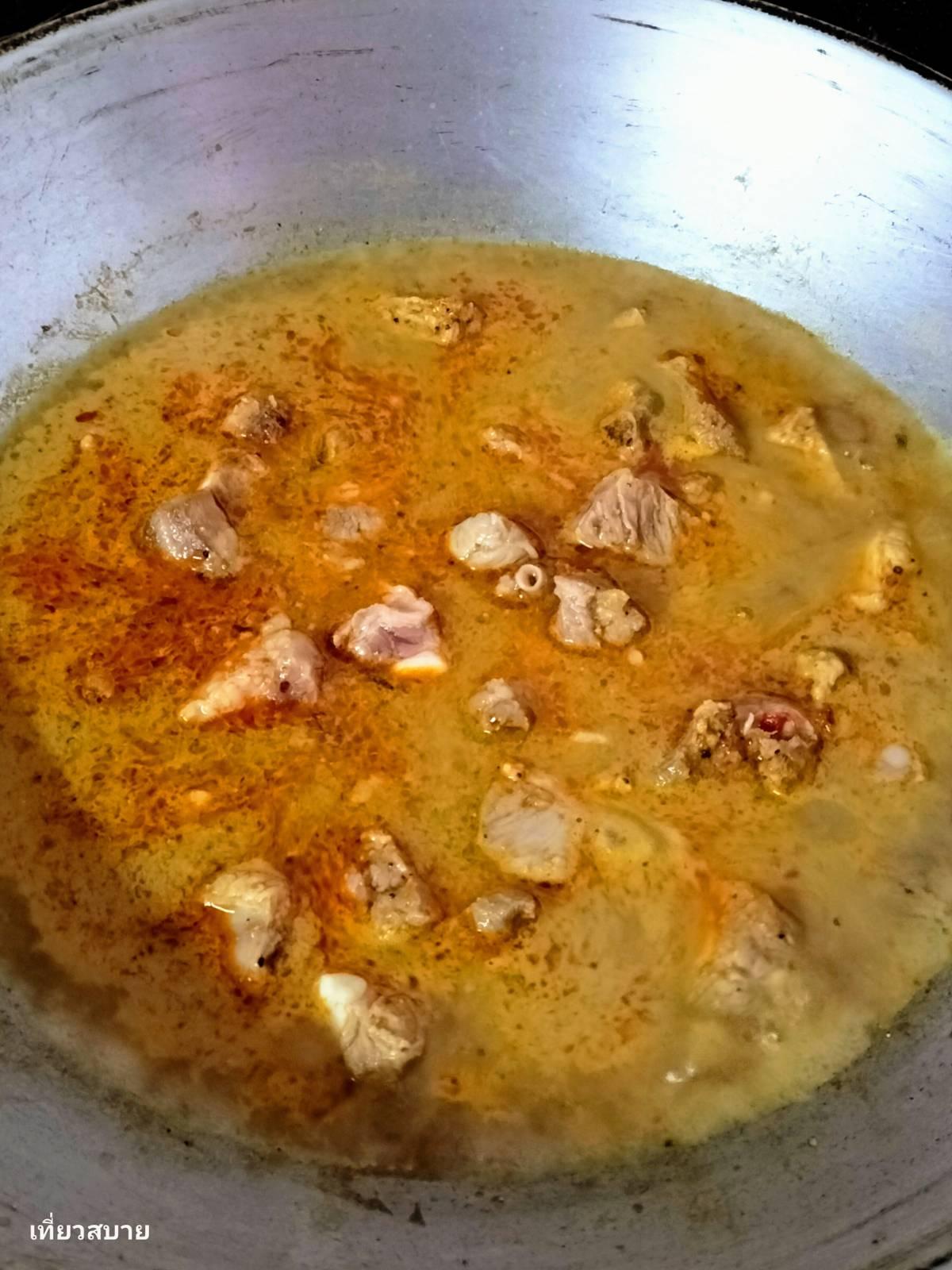 นำซี่โครงหมูลงไปผัดกับพริกแกง เติมหางกะทิพอท่วม เคี่ยวด้วยไฟอ่อนๆ จนซี่โครงเปื่อยนุ่ม