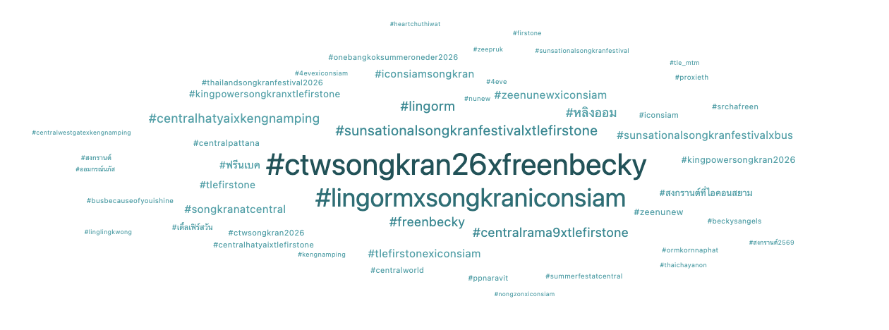 - จากรูป แฮชแท็กที่มีความโดดเด่นที่สุดคือ #CTWSongkran26xFreenBecky