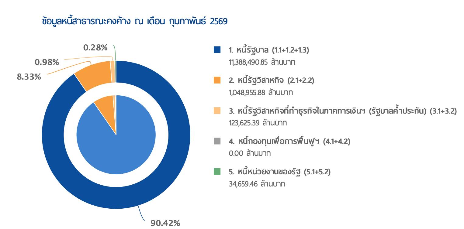 พร้อมกันนี้ เพื่อเป็นการทลายข้อจำกัดในการก่อหนี้ รัฐบาลเตรียมพิจารณาขยายกรอบเพดานหนี้สาธารณะควบคู่กันไปด้วย จากข้อมูล ณ เดือน ก.พ. 2569 ประเทศไทยมียอดหนี้สาธารณะอยู่ที่ 12.59 ล้านล้านบาท คิดเป็น 66% ของจีดีพี ซึ่งขยับเข้าใกล้เพดานที่กำหนดไว้ 70% ดังนั้นจึงมีความเป็นไปได้สูงที่จะมีการพิจารณาขยายเพดานหนี้สาธารณะเพิ่มขึ้นเป็น 75% เพื่อเปิดช่องว่างให้รัฐบาลสามารถกู้เงินเพิ่มได้อีกเกือบ 1 ล้านล้านบาท เพื่อใช้เป็นกันชนทางเศรษฐกิจ