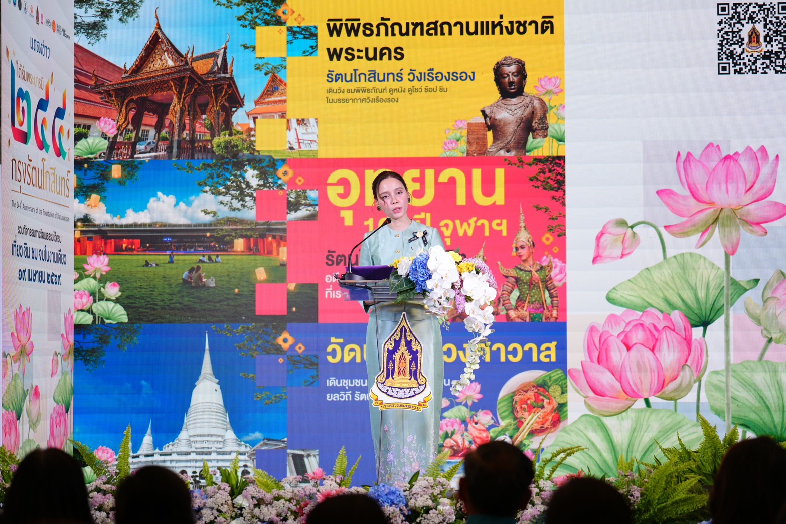วันที่ 19 เมษายน 2569 เวลา 17.00 น. นางสาวซาบีดา ไทยเศรษฐ์ รัฐมนตรีว่าการกระทรวงวัฒนธรรม เป็นประธานงานเเถลงข่าวการจัดงาน “ใต้ร่มพระบารมี 244 ปี กรุงรัตนโกสินทร์“ โดยมี นายประสพ เรียงเงิน ปลัดกระทรวงวัฒนธรรม ผู้บริหารกระทรวงวัฒนธรรม ผู้บริหารบริษัทสยามพิวรรธน์ จำกัด ผู้เเทนหน่วยงานที่เกี่ยวข้อง ดารา อินฟลูเอนเซอร์ สื่อมวลชน เเละเเขกผู้มีเกียติ เข้าร่วม ณ Creative Space ชั้น 3 ศูนย์การค้าสยามดิสคัฟเวอร์รี่ กิจกรรมภายในงานเเถลงข่าวมีการเเสดงทางศิลปวัฒนธรรม การพูดคุยถึงกิจกรรมไฮไลท์ของงานโดยผู้เเทนจาก 3 พื้นที่ บูธสาธิตอาหารไทย ขนมไทย เเละวัฒนธรรมไทย อาทิ การทำขนมครก อาหารชาววัง การทำบุหงารำไป การสานปลาตะเพียน เเละบูธถ่ายภาพ Generate AI