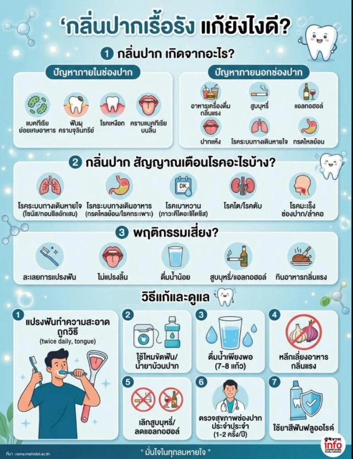 บทความนี้จะพาไปสำรวจต้นตอของกลิ่นปากเรื้อรัง พฤติกรรมเสี่ยง สัญญาณโรคที่ควรระวัง พร้อมวิธีดูแลและจัดการอย่างตรงจุด เพื่อให้คุณกลับมามั่นใจในทุกลมหายใจ