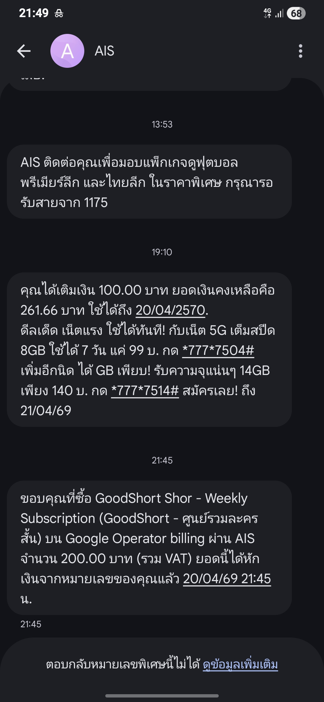 มีข้อความขึ้นมาว่าโดนหักเงินจาก ais ค่าสมัครGoodShort Shor - Weekly Subscription (GoodShort - ศูนย์รวมละครสั้น)