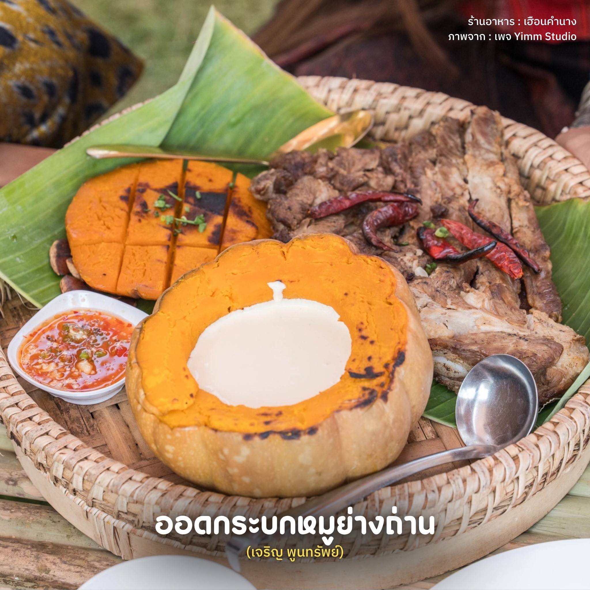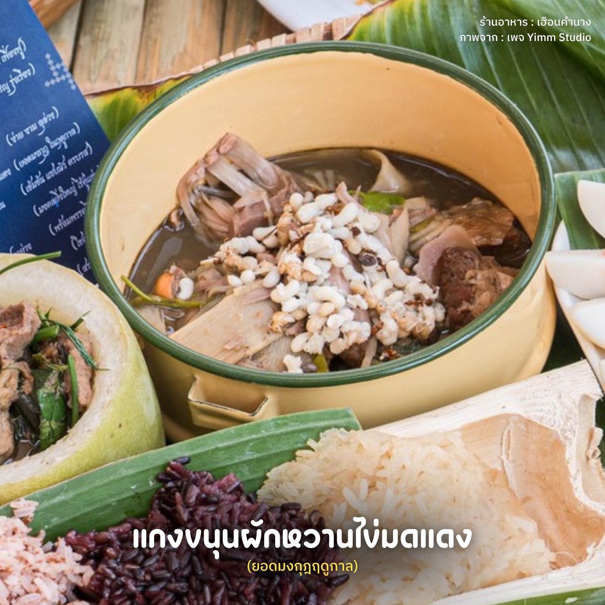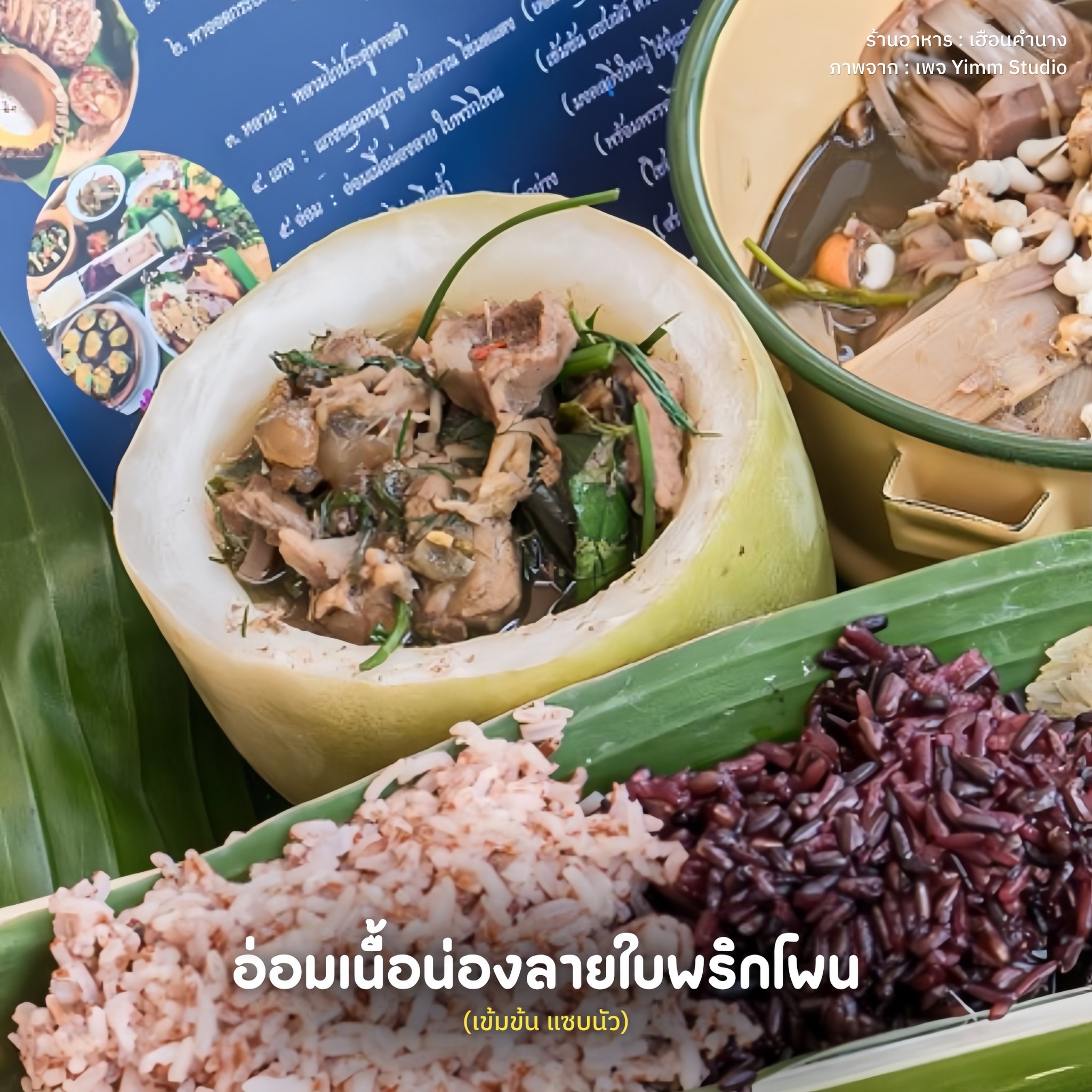 อ่อมเนื้อน่องลายใบพริกโพน : "อ่อม" สื่อถึงความร่มเย็นเป็นสุข อุดมสมบูรณ์ และเป็นอาหารที่แสดงถึง