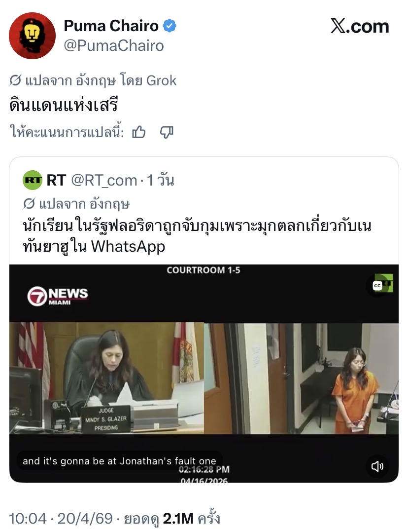 Gabriela Saldana นักศึกษาวัย 23 ปีจากมหาวิทยาลัย Florida International University (FIU) ดันถูกจับกุมเมื่อเดือนเมษายน 2026 หลังจากโพสต์ข้อความเชิงข่มขู่ในกลุ่ม WhatsApp ที่มีสมาชิกประมาณเพียงแค่ 215 คน แค่เธอกล่าวถึงนายกรัฐมนตรีอิสราเอล Benjamin Netanyahu ในเชิง "ล้อเล่น" เกี่ยวกับการวางระเบิดในมหาวิทยาลัย แค่นั้นเอง