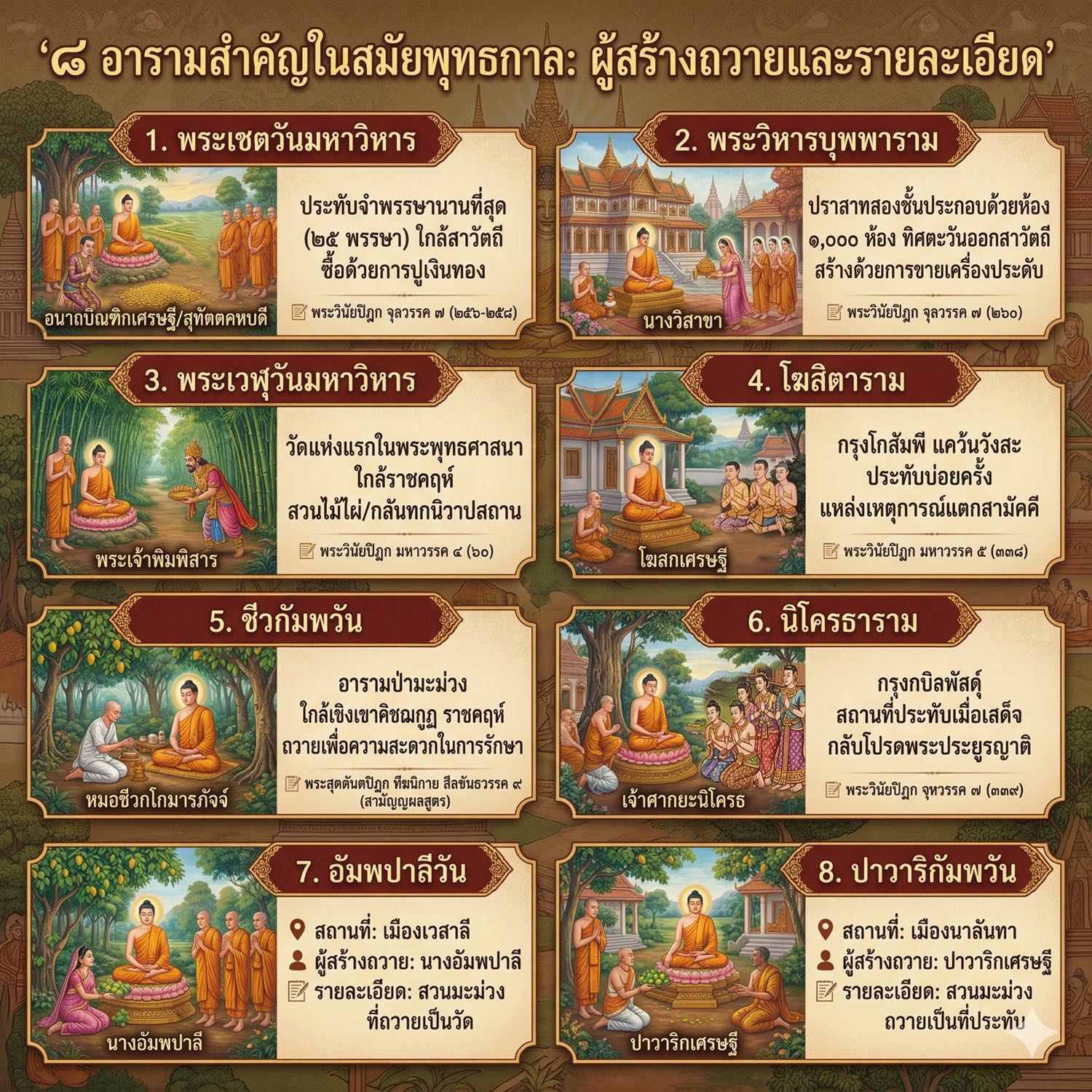 • รายละเอียด: อารามป่ามะม่วง ตั้งอยู่ใกล้เชิงเขาคิชฌกูฏ กรุงราชคฤห์ หมอชีวกสร้างถวายเพื่อให้พระพุทธเจ้าประทับอยู่ใกล้ๆ จะได้ไปเฝ้าและรักษาไข้ได้สะดวก
