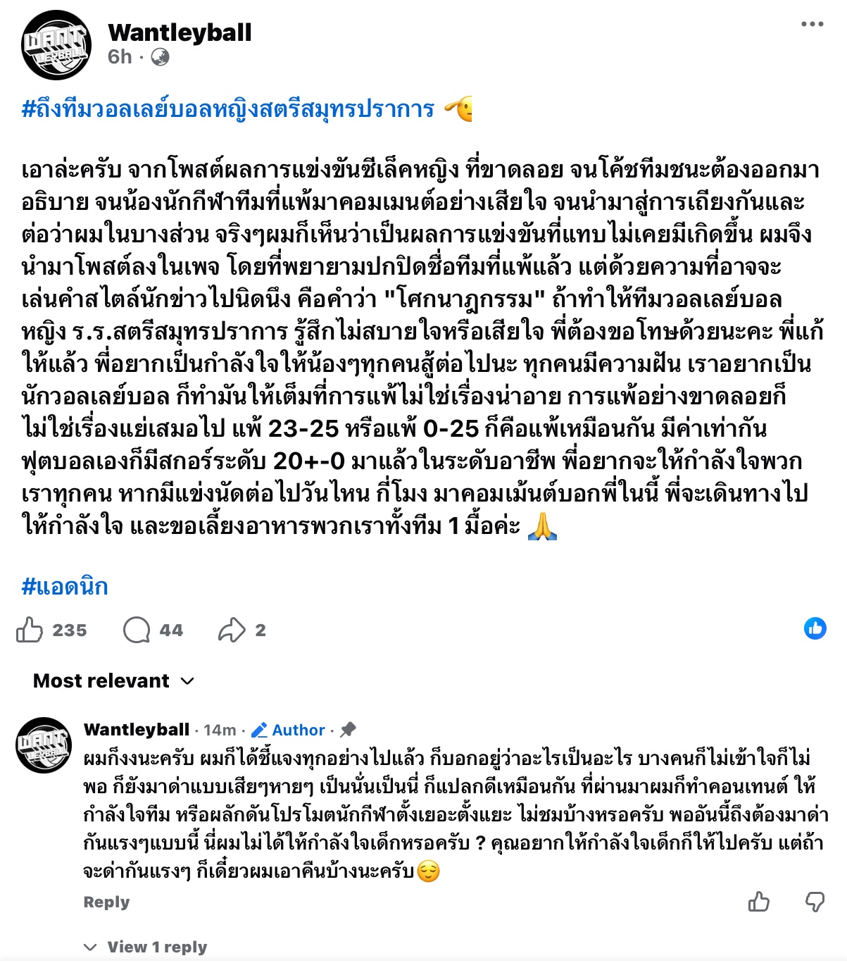 สาวออมถิงออกมาตักเตือนเพจWantleyball หลังโพสต์เกี่ยวกับผลทีมหญิงสตรีสมุทรปราการว่าขาดลอยเกินไป❤️